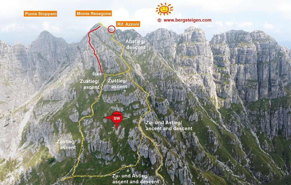 Vom Gipfel des Monte Resegone (1875) auf Betonstufen hinunter zum nahen Rifugio Luigi Azzoni (1860 m) und dann auf dem Weg Nummer 901 zurück zum Aufstiegsweg und auf diesem weiter absteigen.