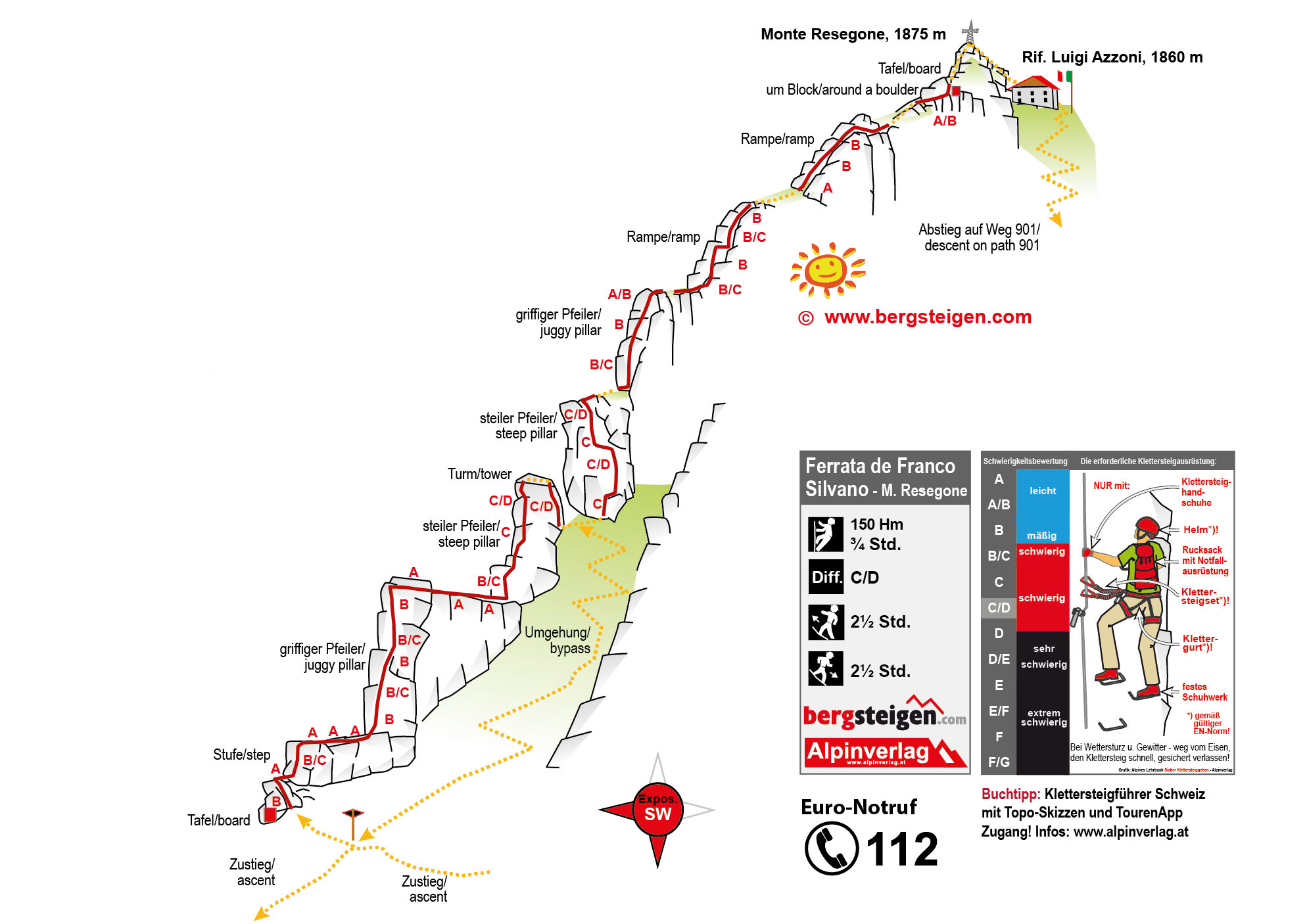 Die Ferrata de Franco Silvio ist ein schöner Gipfelklettersteig, welcher direkt auf den Monte Resegone Gipfel führt. Man folgt einem Grat mit vielen, oft auch recht steilen Aufschwüngen. Die Ferrata ist gut mit der genau unterhalb liegenden Ferrata Centenario am Passo Fo zu kombinieren. Gesamt eine lange Ferrata Tour mit über 1500 Höhenmetern direkt oberhalb des Como-Sees.