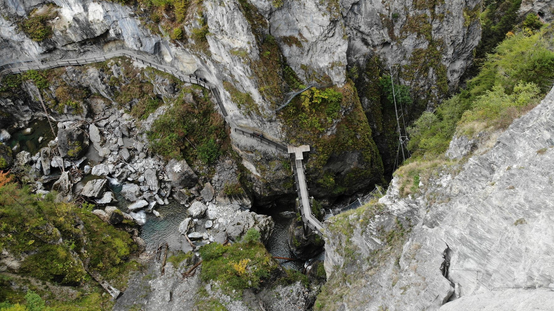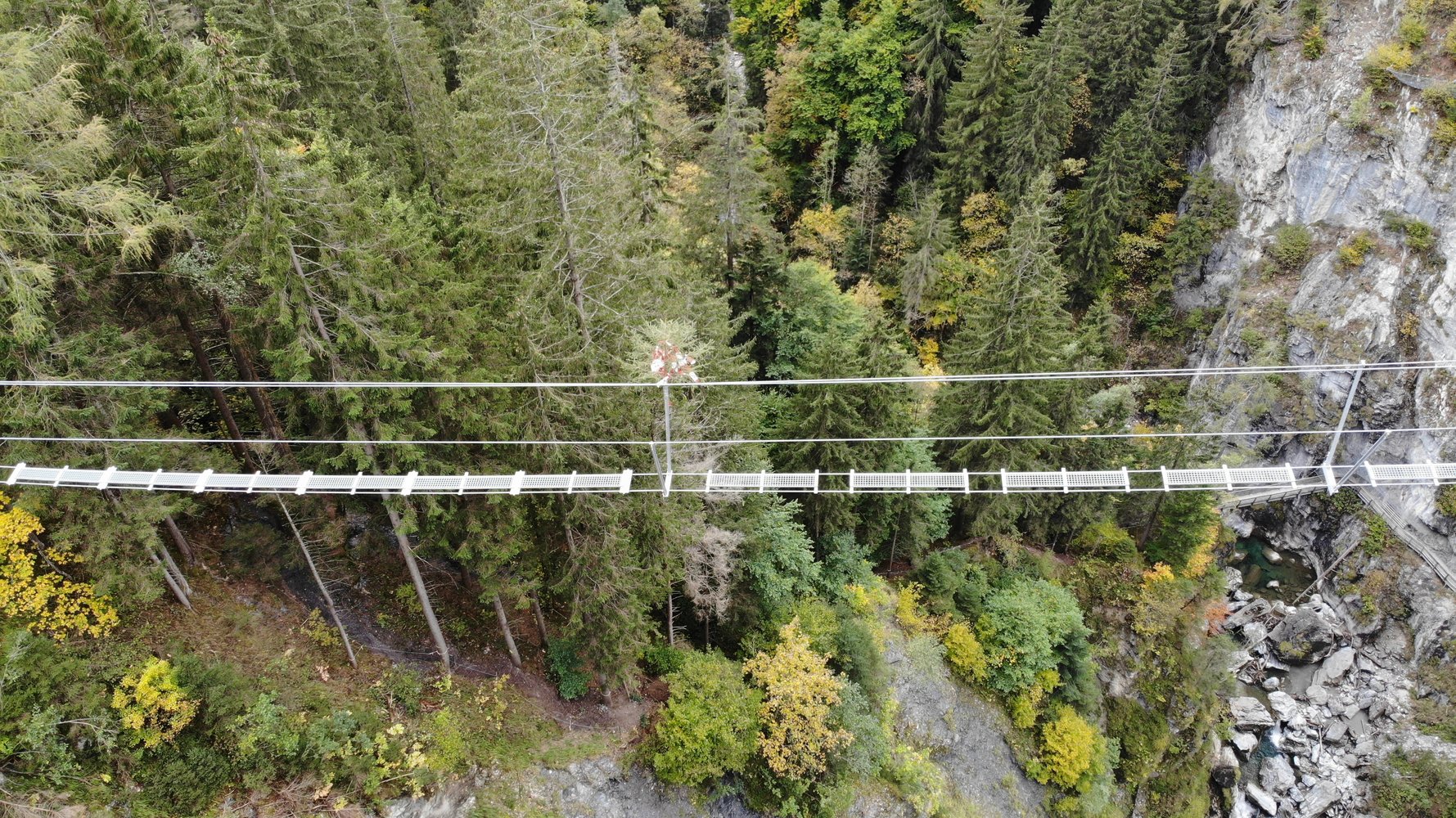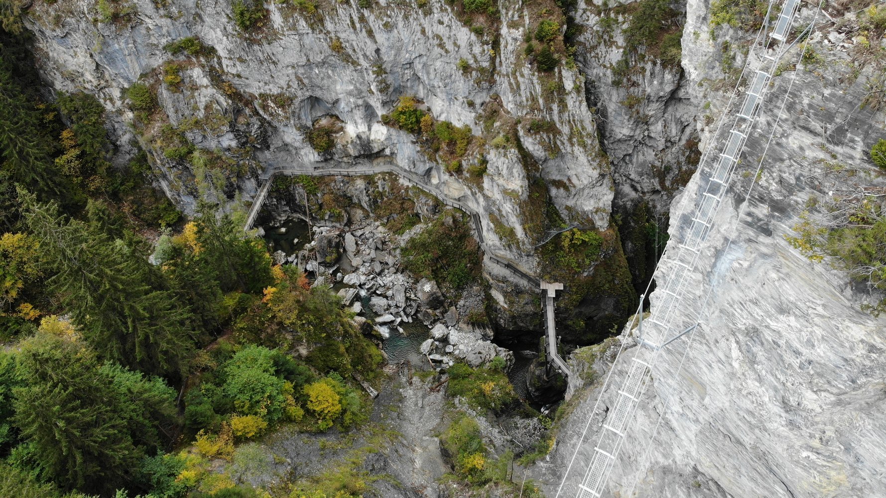 Vom Ausstieg auf dem markierten Pfad etwas aufsteigen, dann nach rechts den steilen Wald hinunter – vorbei am Ausstieg der Seilbrücke –, bis man wieder den Klammweg erreicht.