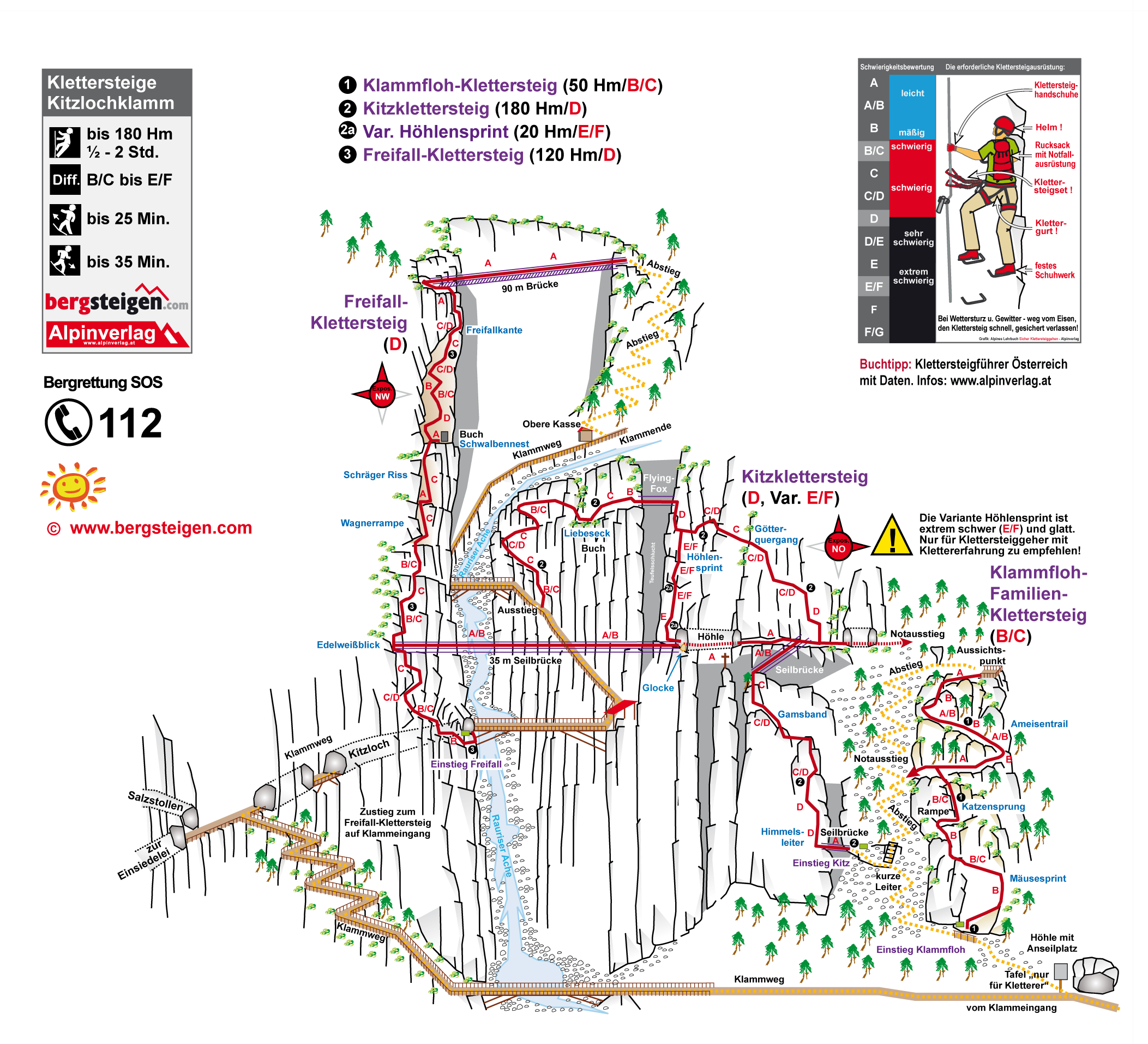 Der Klettersteig ist zwar nur C/D (und kurz D), auf weite Passagen aber sehr ausgesetzt! Der Abstieg ist bei Nässe heikel (steiler, erdiger Wald)!