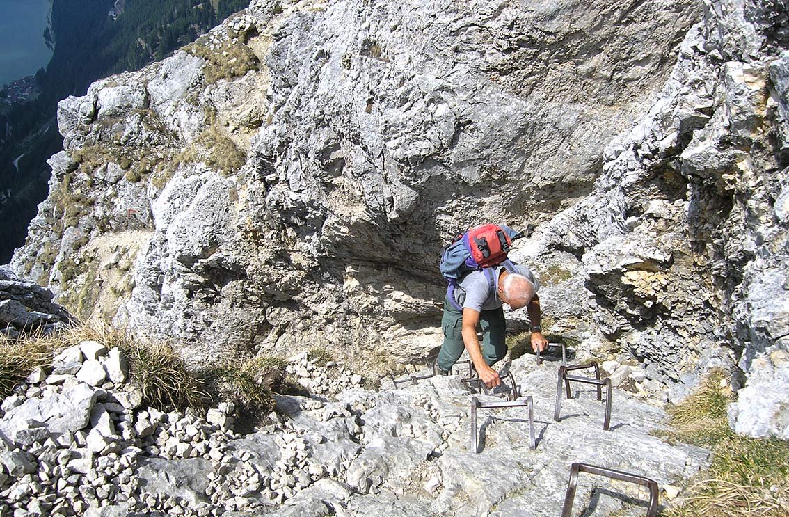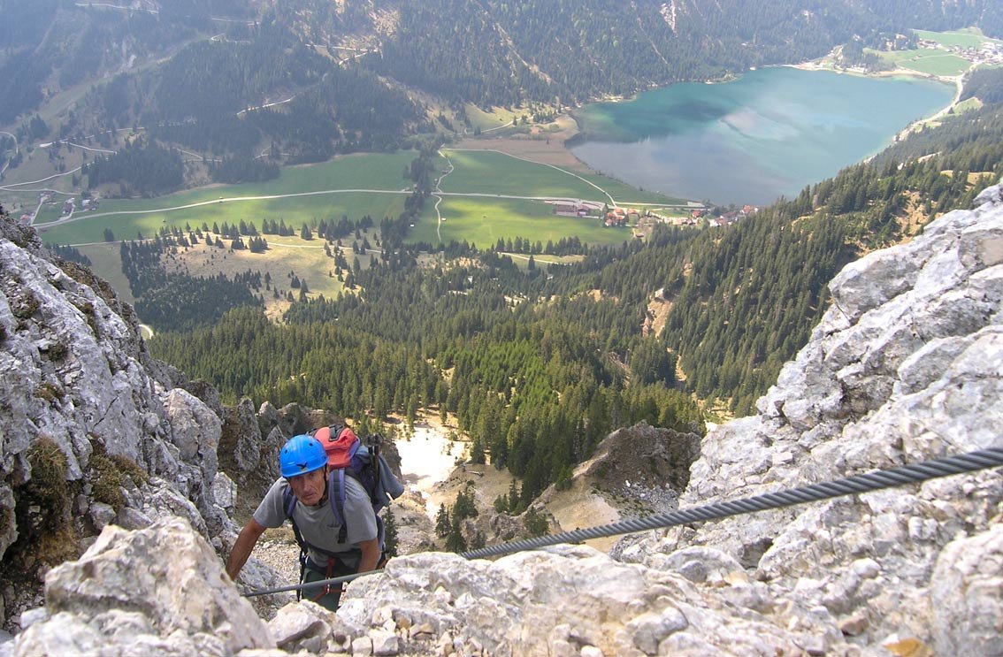 Die sehr steinschlaggefährdete Steilpassage am Schartschrofen sollte nicht unterschätzt werden! Wegen der Südlage kann der Klettersteig meist schon früh im Jahr begangen werden - auch in umgekehrter Richtung vom Gimpelhaus aus. Der Zustieg über den Adlerhorst ist eine lange Rundtour, bei der man ständig den Haldensee im Blickwinkel hat.