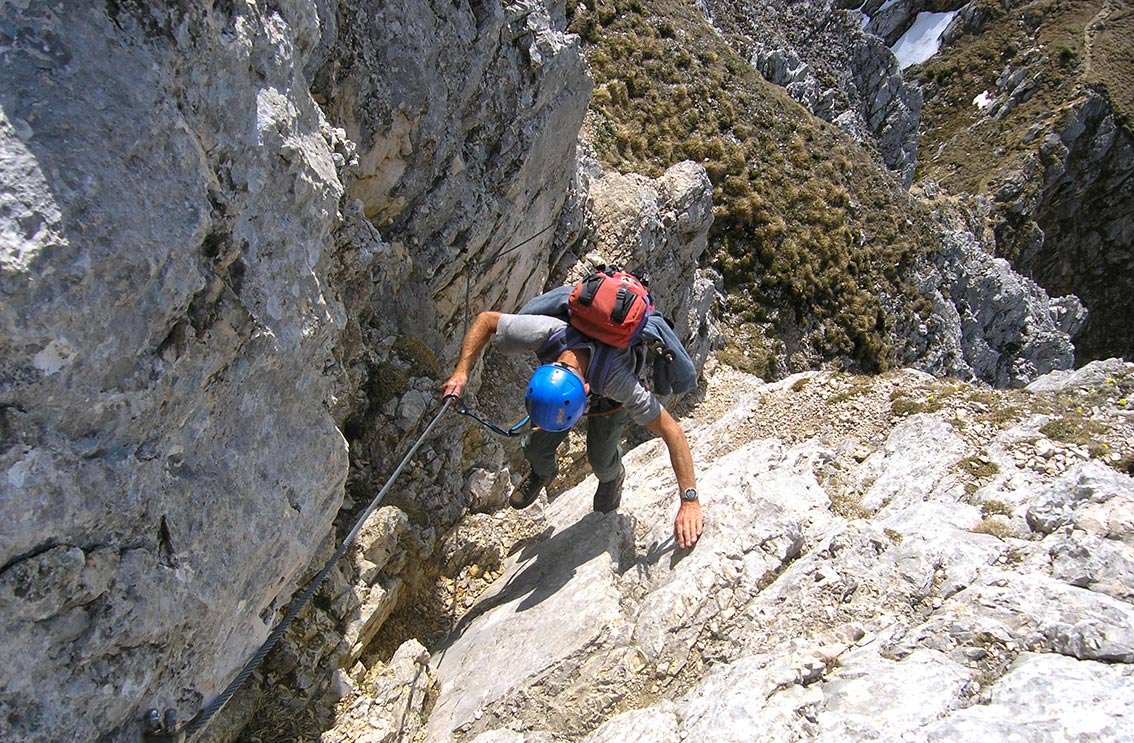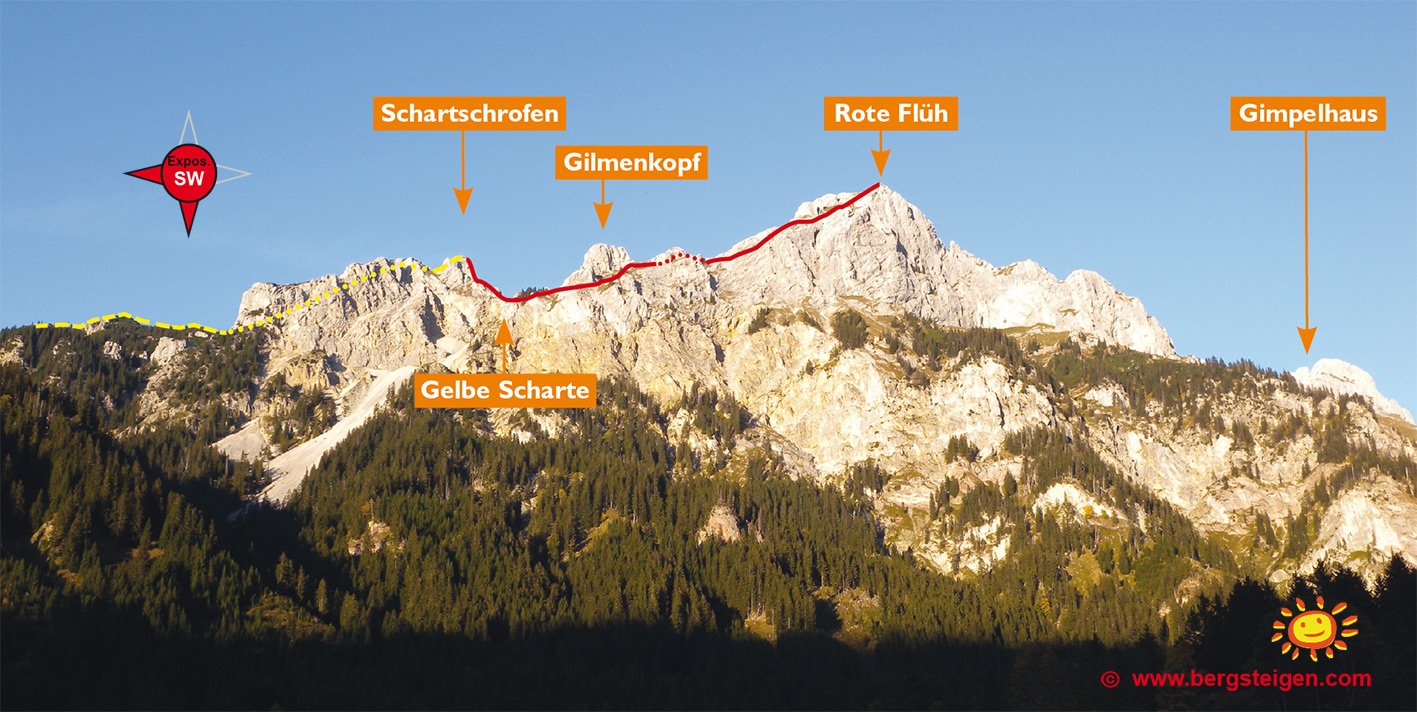 Achtung: Der Abschnitt Gelbe Scharte bis zur Roten Flüh gehört nicht zum eigentlichen Klettersteig, wird aber in der Regel von den Klettersteiggehern begangen. Für diesen Abschnitt ist etwas alpine Erfahrung und absolute Trittsicherheit nötig (es gibt dort einige recht ausgesetzte, ungesicherte Passagen - schwarzer Bergweg!).