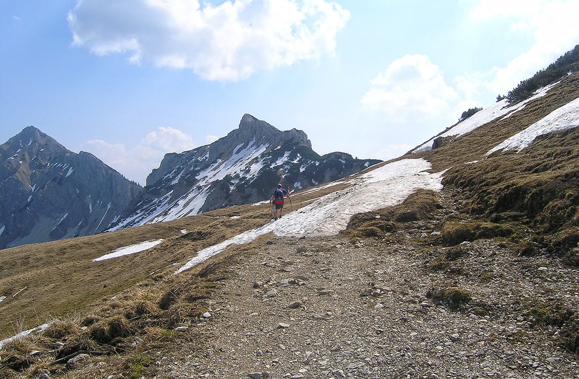 Vom Gipfel über den Normalweg (kurze versicherte Passagen A) hinunter ins Kar und weiter zum Gimpelhaus. Vom Gimpelhaus steil zurück nach Nesselwängle und kurz vor dem Ort nach rechts zum Parkplatz.