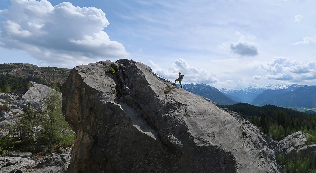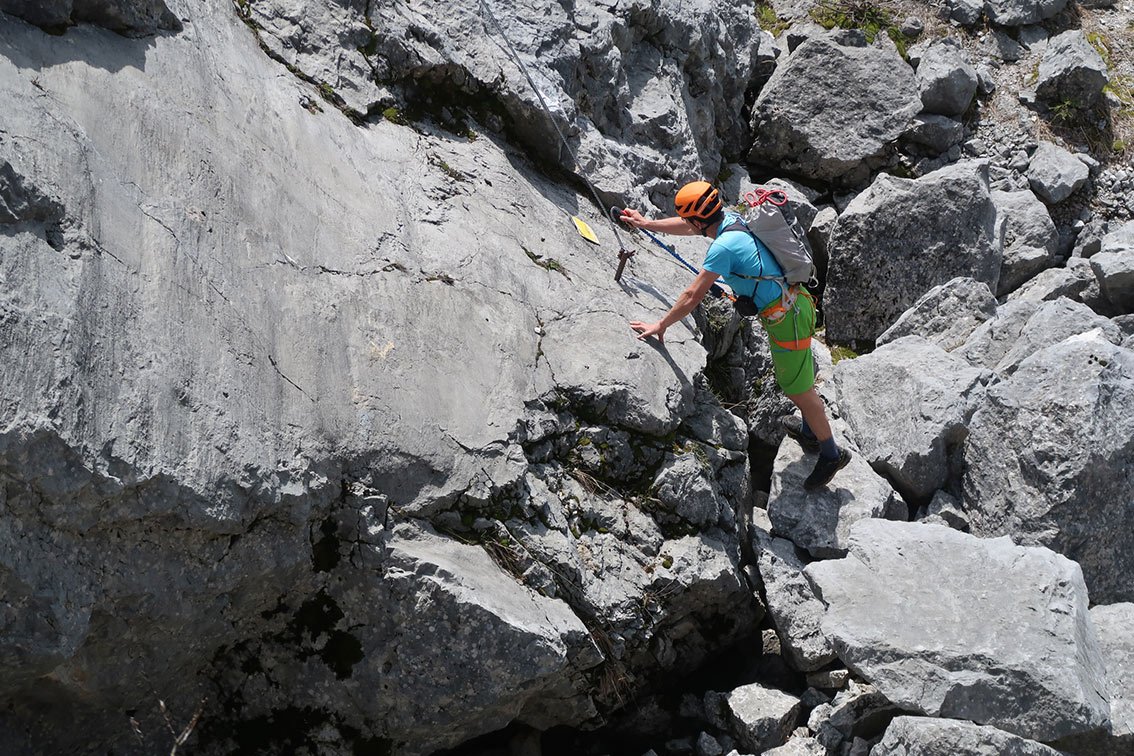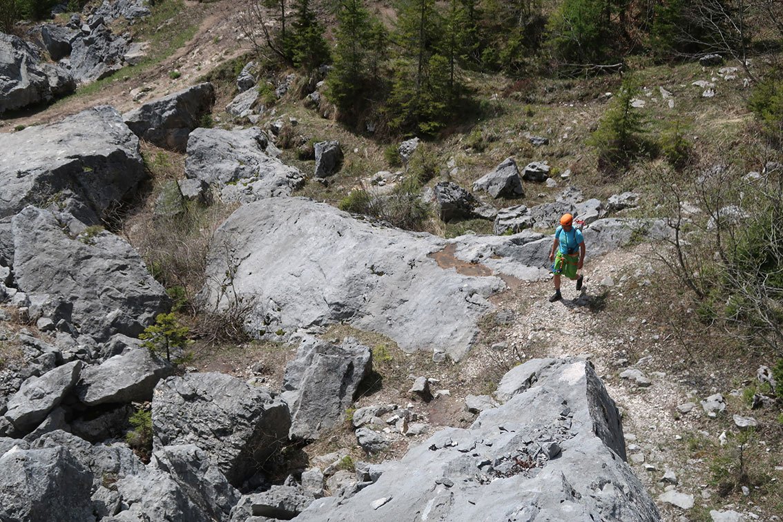 Wer nur den Frosch Klettersteig klettern will, steigt am besten wieder über den Klettersteig ab. Oder vom Ende der Seilbrücke etwas mühsam zwischen den Blöcken hindurch zurück zum Weg und auf diesem zum Ausgangspunkt. Ansonsten vom Ausstieg hinauf zum Einstieg des Lindwurm Klettersteiges (D/E).