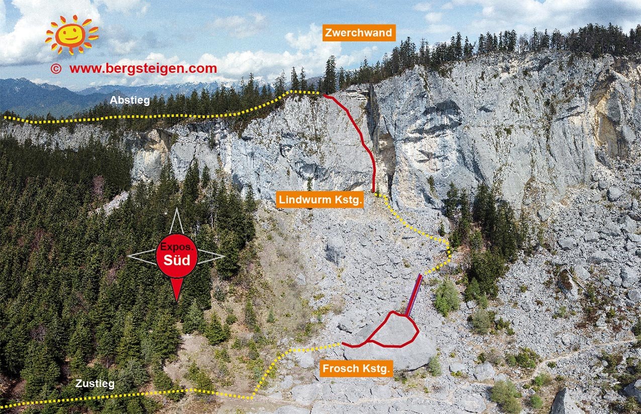 Der Frosch Klettersteig ist ein kurzer, netter Klettersteig im Blockwald unterhalb der Zwerchwand. Das Highlight dieses Steiges ist die 25 Meter lange Seilbrücke am Steigende. Der Klettersteig führt auf einen der unzähligen Felsblöcke unterhalb der Zwerchwand, eine Zweiseilbrücke bildet das Finale. Nur geeignet als Zustiegs-Klettersteig für den schwierigen Lindwurm Klettersteig, dessen Einstieg sich oberhalb der Seilbrücke befindet - nur für den kurzen Frosch-Klettersteig zuzusteigen lohnt sich eher nicht.