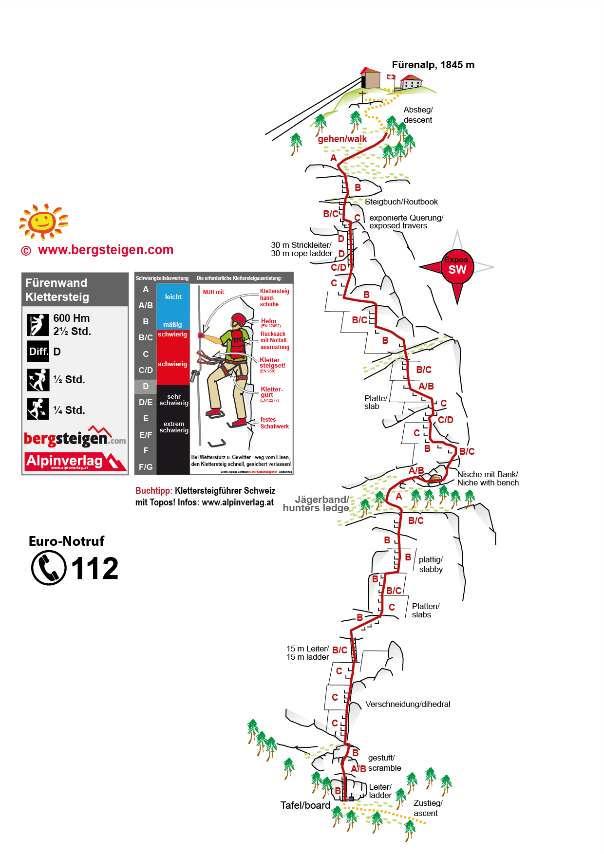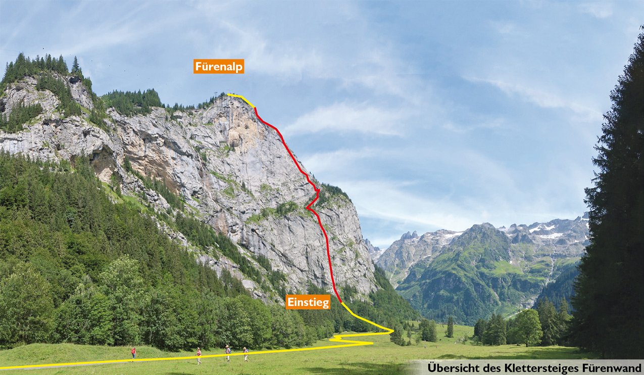 Von der Talstation der Fürenalpbahn folgt man der Straße Richtung Herrenrüti. Auf ca. 1140 m weist ein blauer Wegweiser (Klettersteig-Fürenwand) nach links auf den blau-weiß-blau markierten Weg, dem man in einigen Zickzacks zum Einstieg (Tafel 1240 m) folgt.