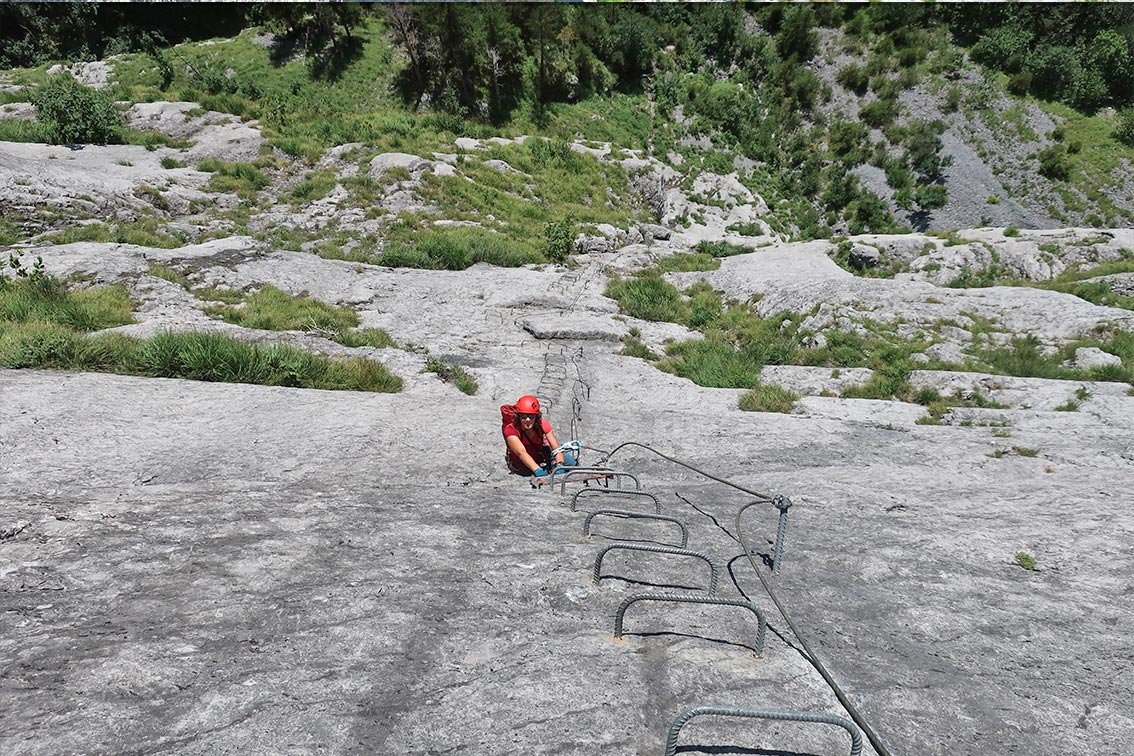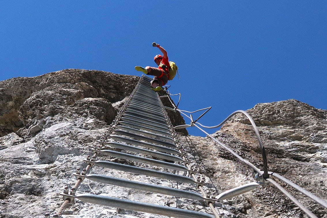 Route: An der Einstiegsleiter (B) hinauf, dann über den Vorbau (A/B u. B) unter eine steile Verschneidung, die man direkt (C/D) überwindet. An deren Ende folgt eine 15 m lange Leiter (B/C), bevor es rechts hinauf in eine Plattenzone geht, die senkrecht, aber mit vielen Trittstiften (B und C) bis auf das Jägerband führt. Auf dem Band (Grat) hinauf (A/B) bis zum oberen Ende, dann nach rechts zu einer Nische mit einer Bank. Eine glatte Platte (B/C) leitet unter das nächste Dach (C/D) und über eine sehr ausgesetzte Wandpassage (C und B/C) klettert man hinauf auf ein kleines Band. Von dort linkshaltend über weniger steile Platten (bis B/C) zur nächsten Überhangzone. Diese sehr steile Passage überwindet man mit einer 30 m hohen leicht überhängenden Strickleiter (D) - sicher das Highlight der Tour. Es folgt noch eine etwas exponierte Querung (C), bevor es gemütlich (B/C und B) hinauf zum Ausstieg geht.
