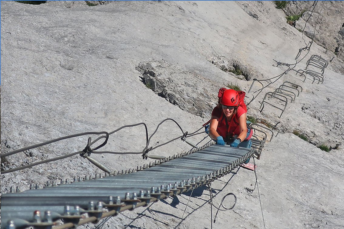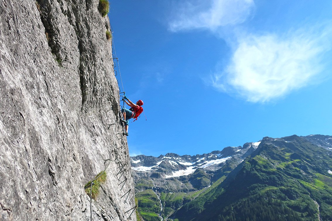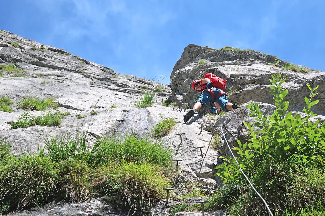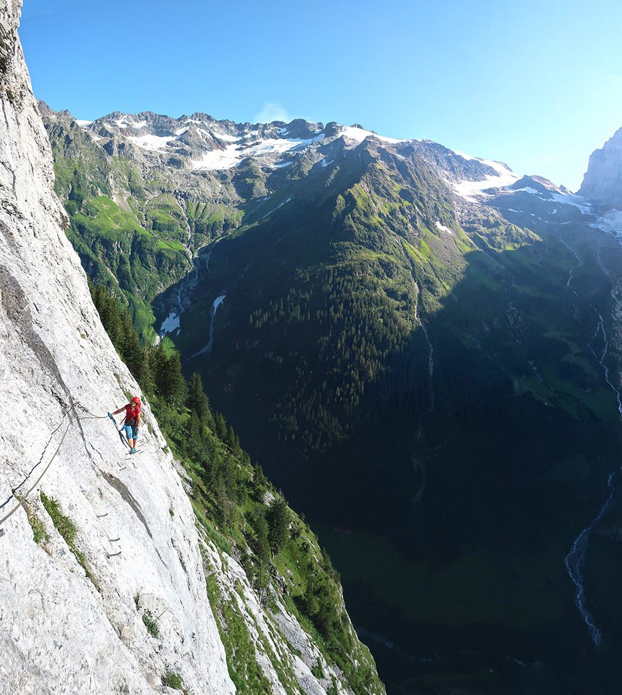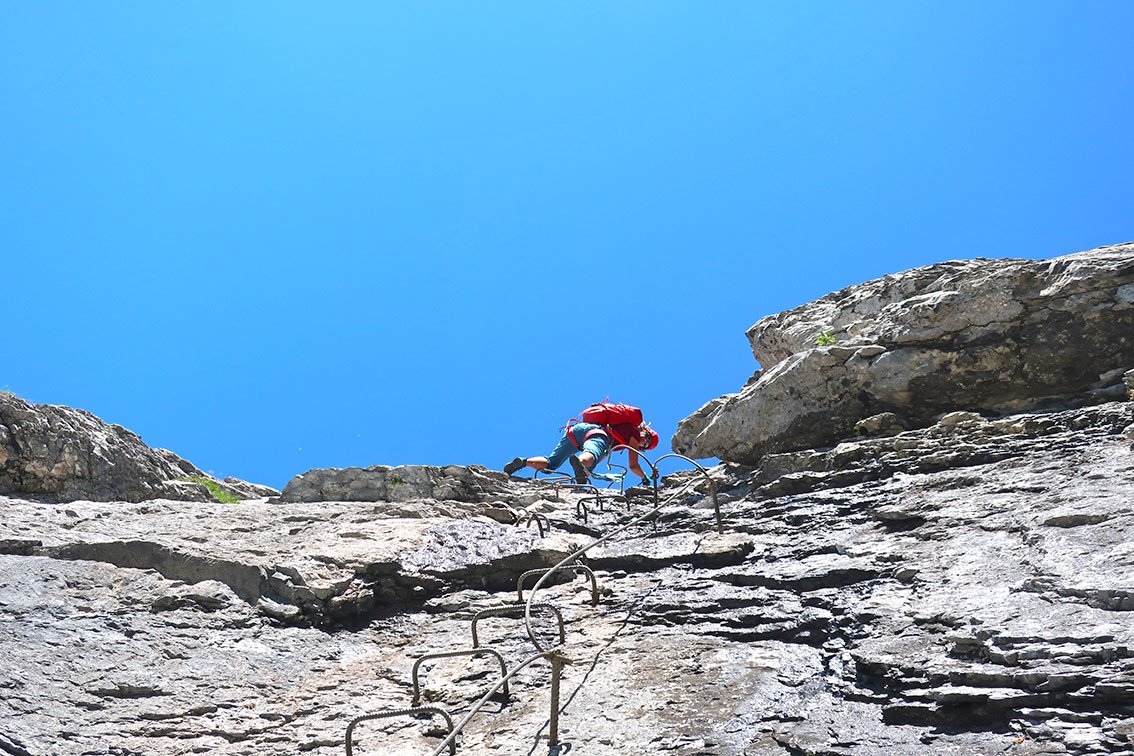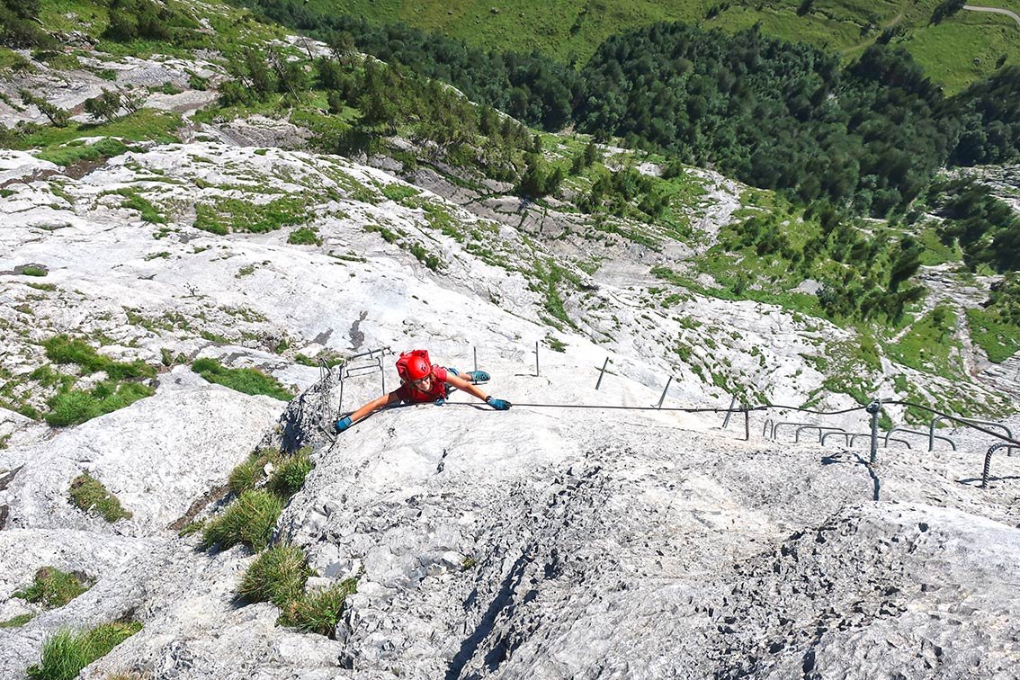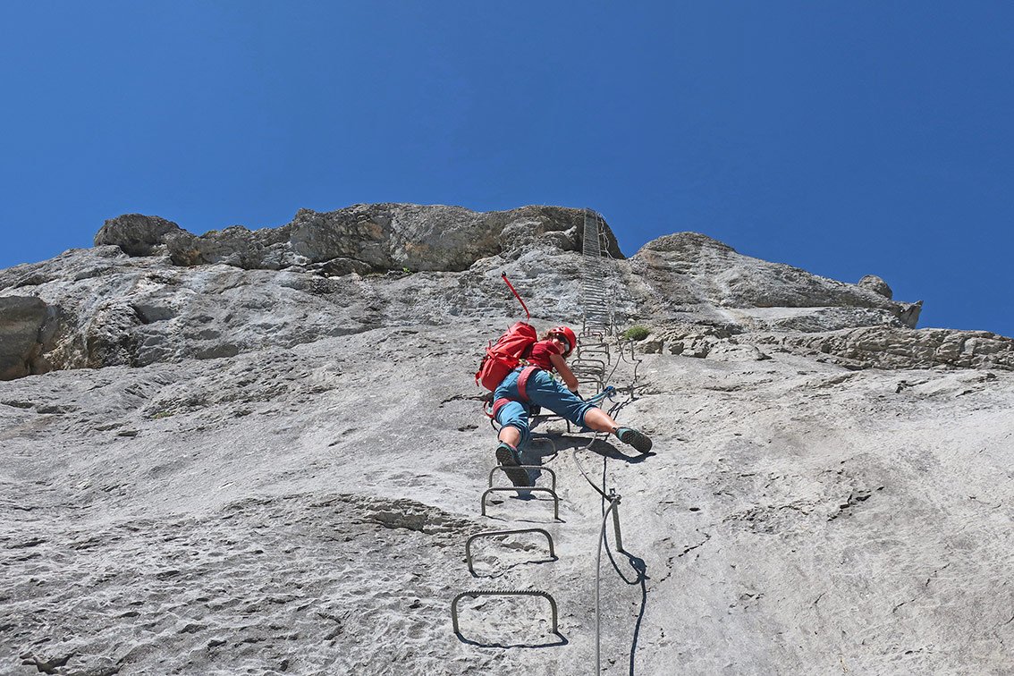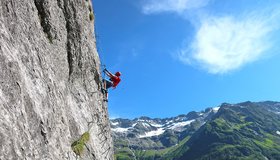 „Stairway to heaven“ wird dieser Klettersteig im lokalen Klettersteigfolder genannt. Zu Recht, denn er ist sicherlich das Highlight im Klettersteig-Eldorado- Engelberg. Kein anderer der fünf Steige, in der zwischen Bergriesen eingebetteten Enklave, kommt der Fürenwand-Ferrata an Steilheit und Schwierigkeit gleich - zu kompakt ist der Fels in der 600 Meter hohen Fürenhochflue. Der Steig ist konstant schwierig und hat am Ende ein Highlight, eine knapp 30 Meter hohe und leicht überhängende Strickleiter. Die Tour ist zwar talnah und hat eine gute Seilbahnanbindung, dennoch sollten Anfänger und Höhenängstliche die Finger davon lassen, denn man braucht eine große Portion Armkraft und eine stabile Psyche, um den Aufstieg an den hunderten Trittstiften durch die senkrechte Wand auch richtig genießen zu können. Es gibt keinen Fluchtweg auf der gesamten Strecke, doch zurückschauen lohnt sich beim Klettern allemal, da man die imposante Nordwand des Titlis (3238 m) stets im Rücken hat.