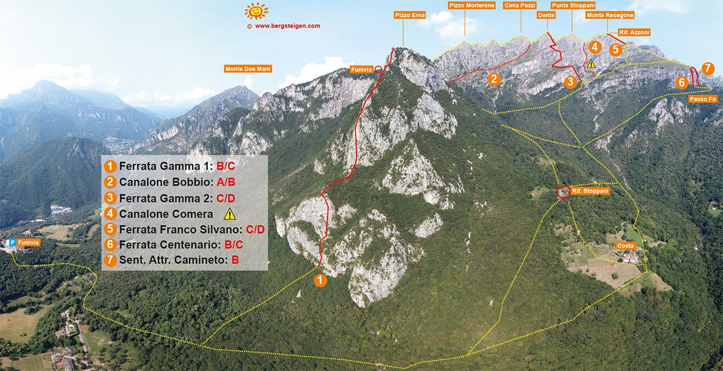 Über den Brenner in Richtung Milano, bei Bergamo verlässt man die Autobahn in Richtung Como/Lecco. In Lecco am südlichen Rand des Comosees fährt man im Zentrum zum Parkplatz der „Funivia d’Erna“ hinauf.