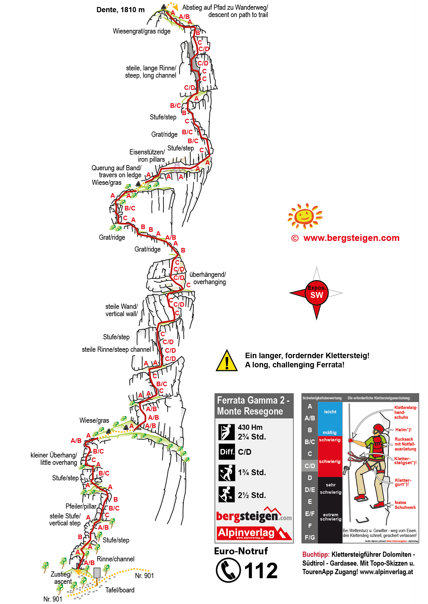 Siehe Topo. Bis zum ersten großen Grasabsatz Stellen C, dann kommt der Mittelteil (oft C/D), nach einer lange Querung steigt man am oberen Teil (mit einer C/D Kaminrinne zum Schluss) zum Gipfel auf.
