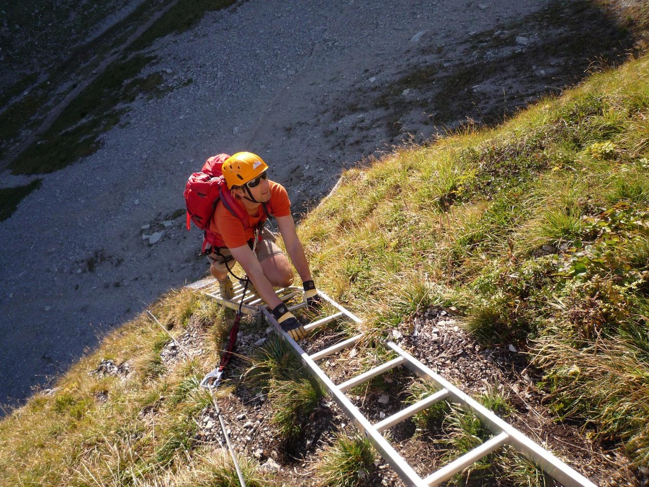 Komplette Klettersteigausrüstung, Helm und Klettersteighandschuhe – für Schwächere ist evtl. die Mitnahme eines Sicherungsseiles sinnvoll!
