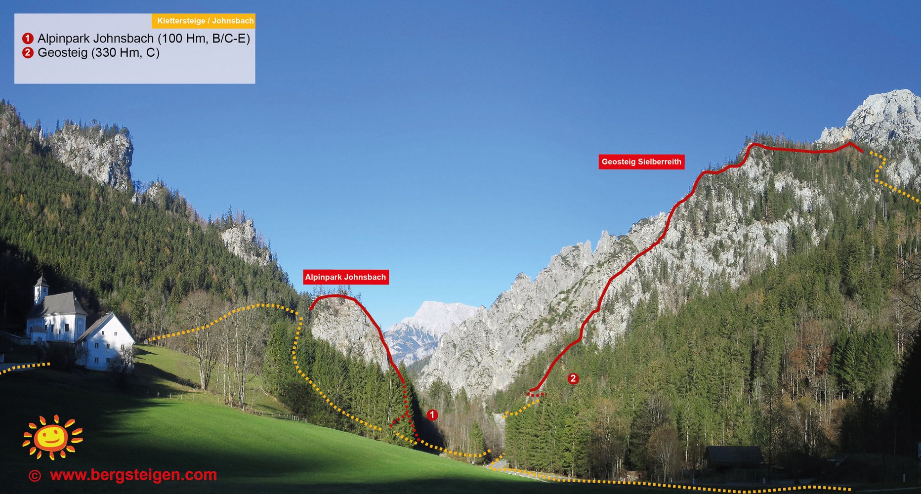 Dieser im Nationalpark Gesäuse gelegene, mittelschwere Steig zählt landschaftlich zu den schönsten Klettersteigen der Ostalpen. Man klettert stets auf dem steilen Grat-Kamm des Silberreiths in Richtung Ödsteingipfel. Man blickt links zu den wilden Felsfluchten der Zwischenmäuer und rechts hinunter auf den berühmten Bergsteigerfriedhof von Johnsbach. Eine einzigartige Postkartenidylle, die es zu bewahren gilt. Das heißt in diesem Fall, bitte auf den markierten Wegen bleiben, evtl. anfallenden Müll mitnehmen und sich in RUHE von diesem einzigartigen Stück Natur verzaubern lassen!