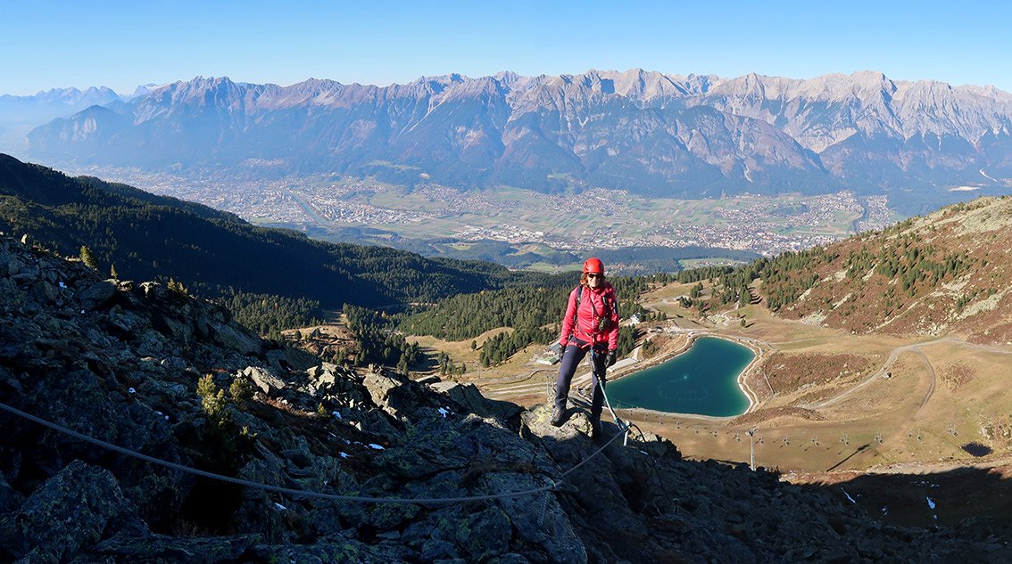 Walking over Karwendel - der alte Glungezer-Klettersteig wurde sehr ansprechend revitalisiert! Es wurden neue Seile gespannt, Stationen mit Bezug auf die Sage „Der Riese vom Glungezer“ (Krone, Hammer, Labyrinth, Tunnel ...) geschaffen und - als absolutes Highlight - eine gewaltige Nepal-Brücke montiert. Die ehemaligen C-Passagen wurden mit Klammern entschärft. So entstand ein anregender Genussklettersteig mit toller Aussicht auf das Inntal.
