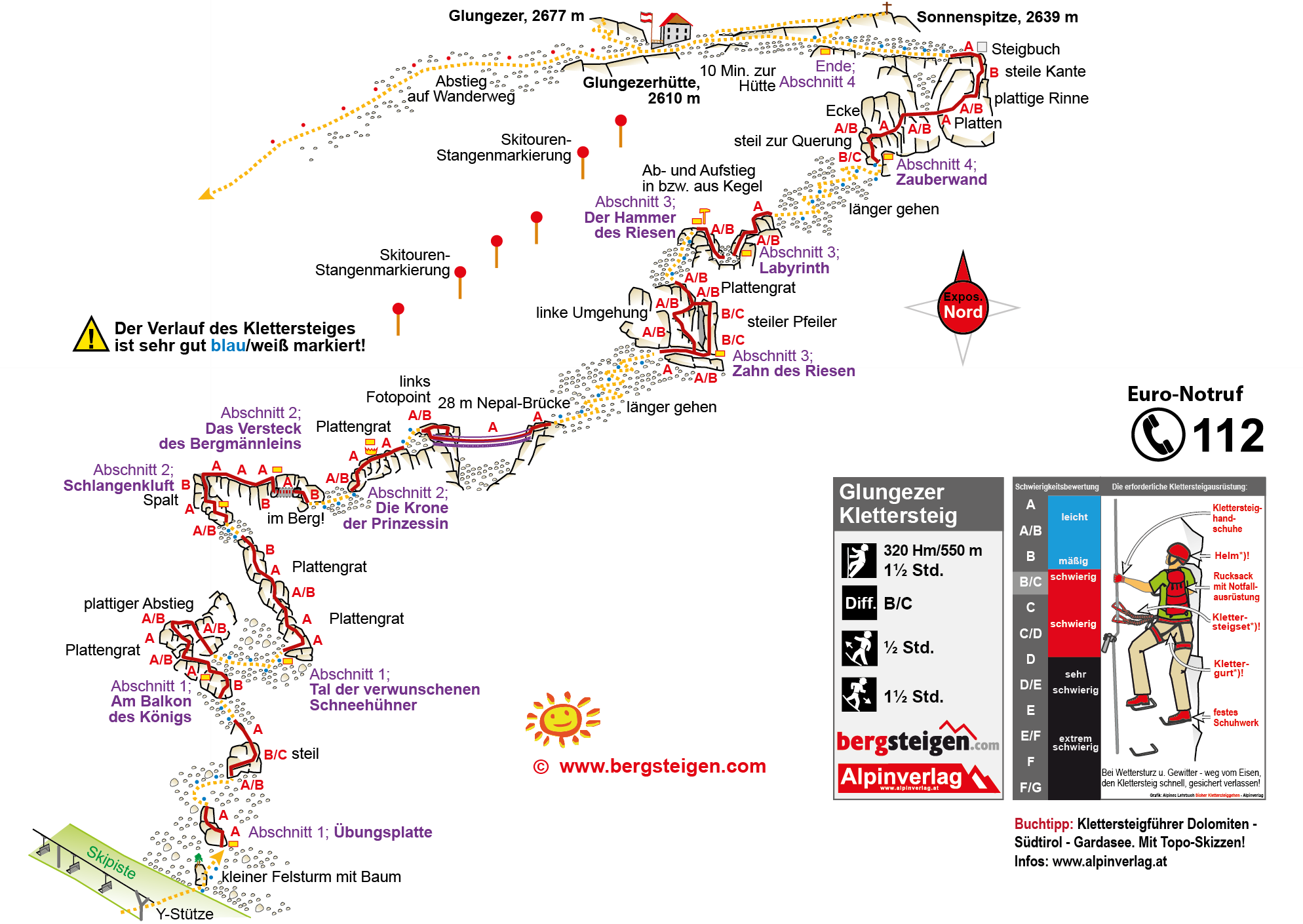 Über die "Übungsplatte" (A) aufwärts und danach zu Fuß zum ersten Aufschwung (B/C) gehen. Nach neuerlichem Gehgelände folgt der "Balkon des Königs", ein Plattengrat (B, dann A und A/B). Am Ende des Grates steigt man rechts in eine Senke "Tal der verwunschnenen Schneehühner" ab. Ein weiterer Plattengrat (A , A/B und kurz B) führt - getrennt durch ein kurzes Gehstück - zur sogenannten "Schlangenkuft". Ein steiler Spalt (B) aus dem man rechts aussteigt und flach "das Versteck des Bergmännleins" erreicht. Dieser höhlenartige Spalt (B, A und B) führt einen durch den Berg. Es folgt kurzes Gehgelände und man kommt auf einen Grat (A/B und A) zur "Krone der Prinzessin". Danach erreicht man gehend die 28 m Nepal-Brücke (A/B und A) - das Highlight des Klettersteiges. Ein längeres Gehstück führt zum "Zahn des Riesen" auf den man steil (B/C - kann man links einfacher A/B umgehen) hinauf klettert. Nach einem kurzen Gehstück kommt man in das sog. "Labyrinth", der Einstieg wird vom "Hammer des Riesen" markiert. Man klettert hinunter und dann an der anderen Seite wieder hinaus (A/B). Ein längerer Fußmarsch führt zur "Zauberwand", welche steil (B/C) und glatt zu einer Querung (A/B) führt. Eine steile Kante (B) führt hinauf zum Steigbuch und man erreicht (A) das Ende der Seilsicherung. Dort weiter nach links entlang des Steinrückens bzw. rechts daneben zur Glungenzerhütte oder rechts, steiler zur Sonnenspitze aufsteigen.