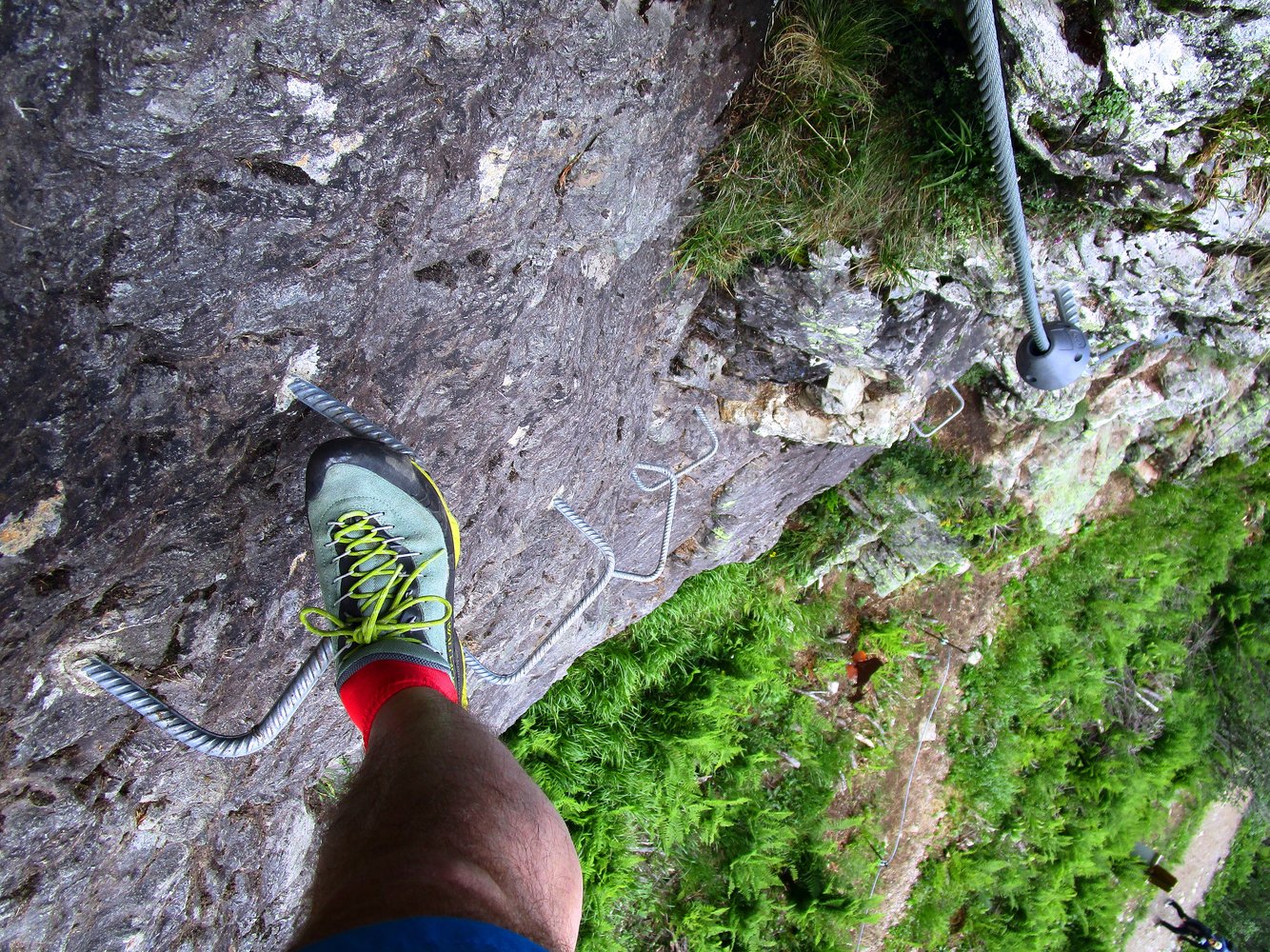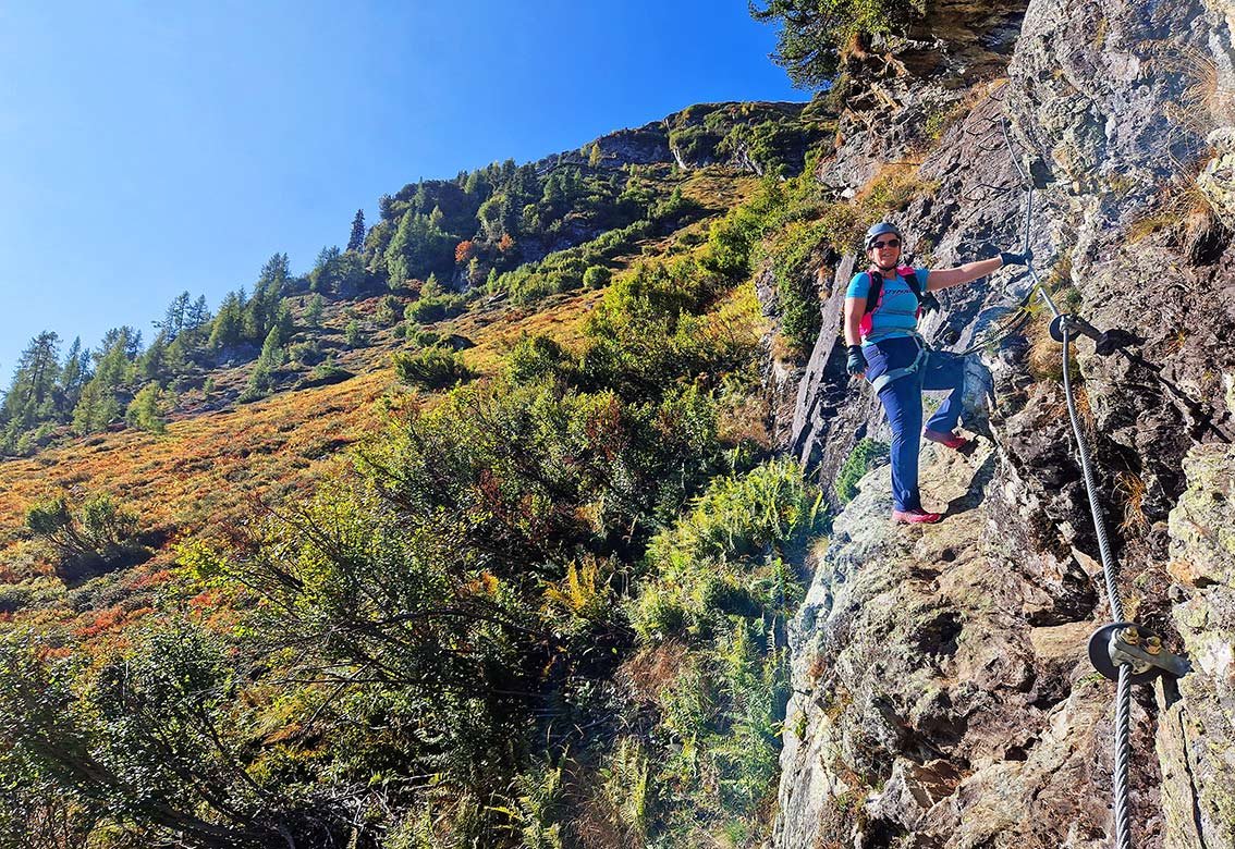 Siehe Topo: Auf dem erdigen Pfad mit Geländerseil (A) zur Wand. Es folgt ein pattiges Band in Richtung Schlüsselstelle (A/B, teilweise Klemmen). Über die kurze, senkrechte Wand hinauf (C - Klammen) und wieder leichter zum höchsten Punkt mit Steinbock (A/B). Es folgt nach rechts die Ausstiegsquerung (A, erdig; eine Stelle über eine Felsplatte mit 2 Klemmen A/B).