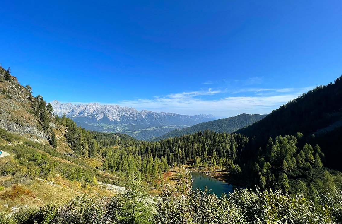 Vom Ende der Drahtseilsicherung in wenigen Minuten dem Pfad zurück zum Wanderweg folgen. Wer direkt zurück zum Preunegg Jet will, wandert in nicht einmal 10 Minuten auf dem Weg Nr.66 zurück zum See und zur Bergstation.