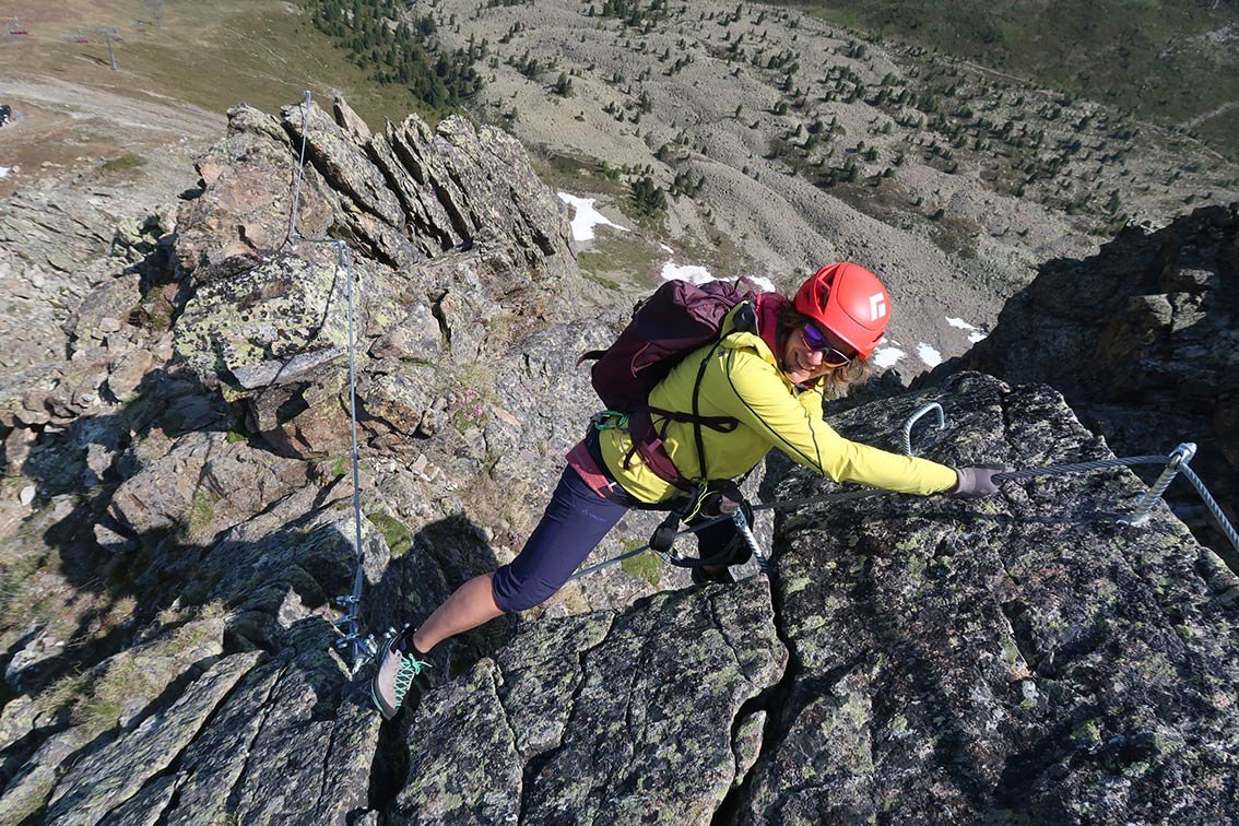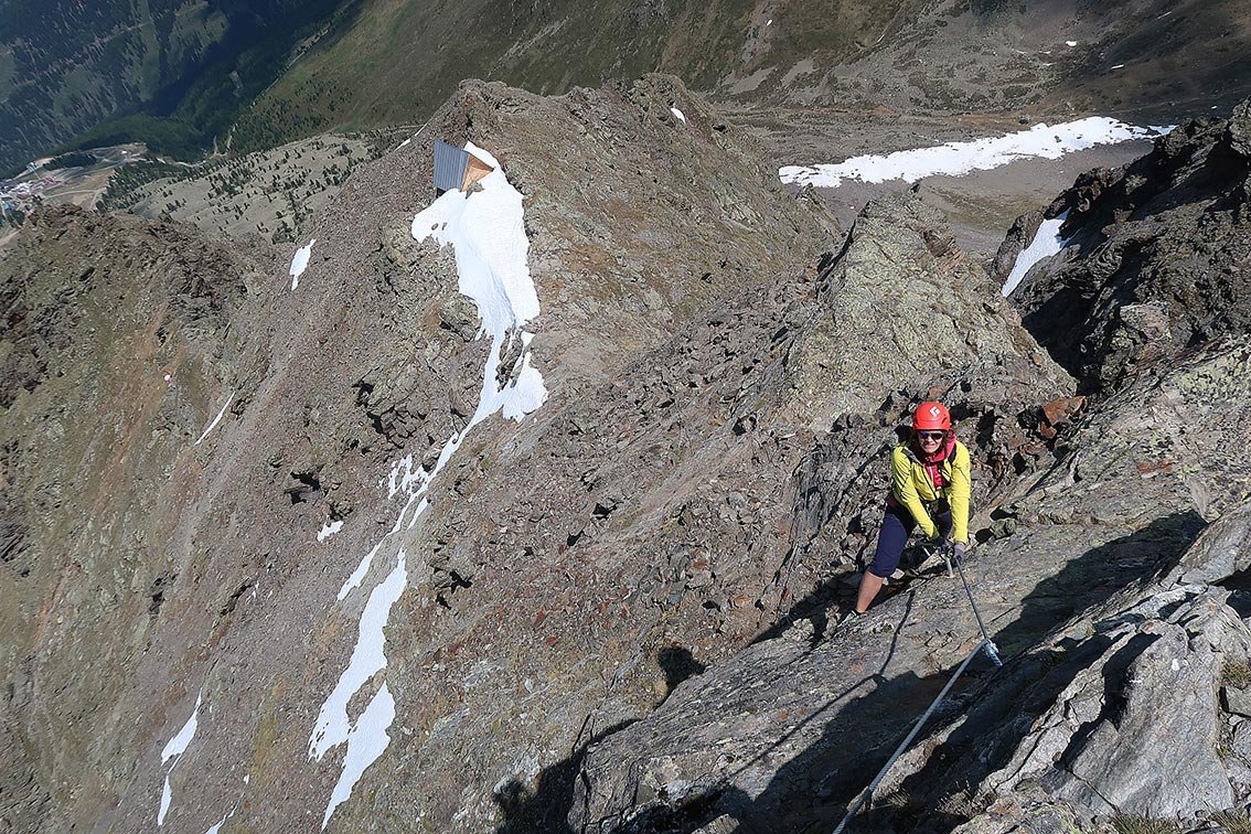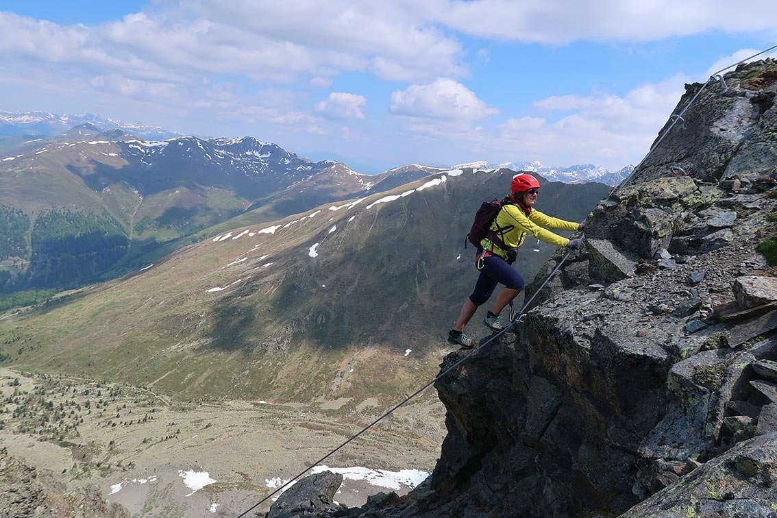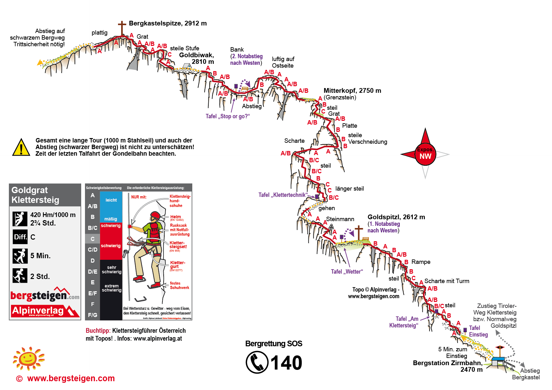 Für Klettersteigeinsteiger sind deswegen die kürzeren Varianten mit Abstieg (über die Notabstiege) vom Goldspitzl bzw. maximal bis zum Ausstieg kurz vor der Biwakschachtel empfehlenswert (siehe Topo).
