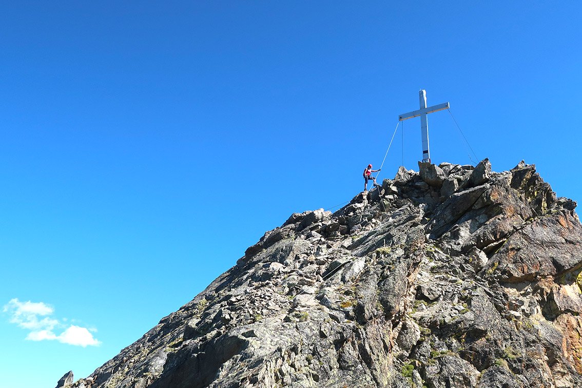 Vom Einstieg gestuft (A), über kurze, steilere Stufen (bis C) zum Goldspitzl (2612 m, Gipfelkreuz, Rastbank, erster Notabstieg nach Westen). Auf dem Grat (A) bis zu steilerem Aufschwung (B/C und C), danach leichter (B, kurz C) zum Mitterkopf 2750 m. Weiter am Klettersteig (B) bis zu einer Bank (Stop or go Tafel, zweiter Notabstieg nach Westen). Aufwärts zum Goldbiwak (2810 m), danach folgt noch eine C-Stufe vor dem Gipfel. Am Ende auf dem gestuften Grat (A/B) bis zum höchsten Punkt auf 2912 m.