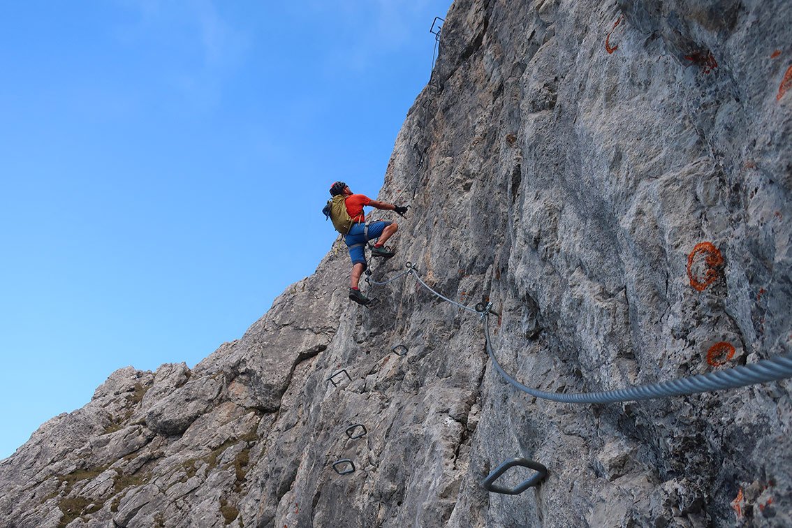 Klettersteig-Grundausrüstung, Klettersteighandschuhe und Helm. Für Kinder u. Anfänger nicht zu empfehlen bzw. um bedingt Sicherungsseil erforderlich!