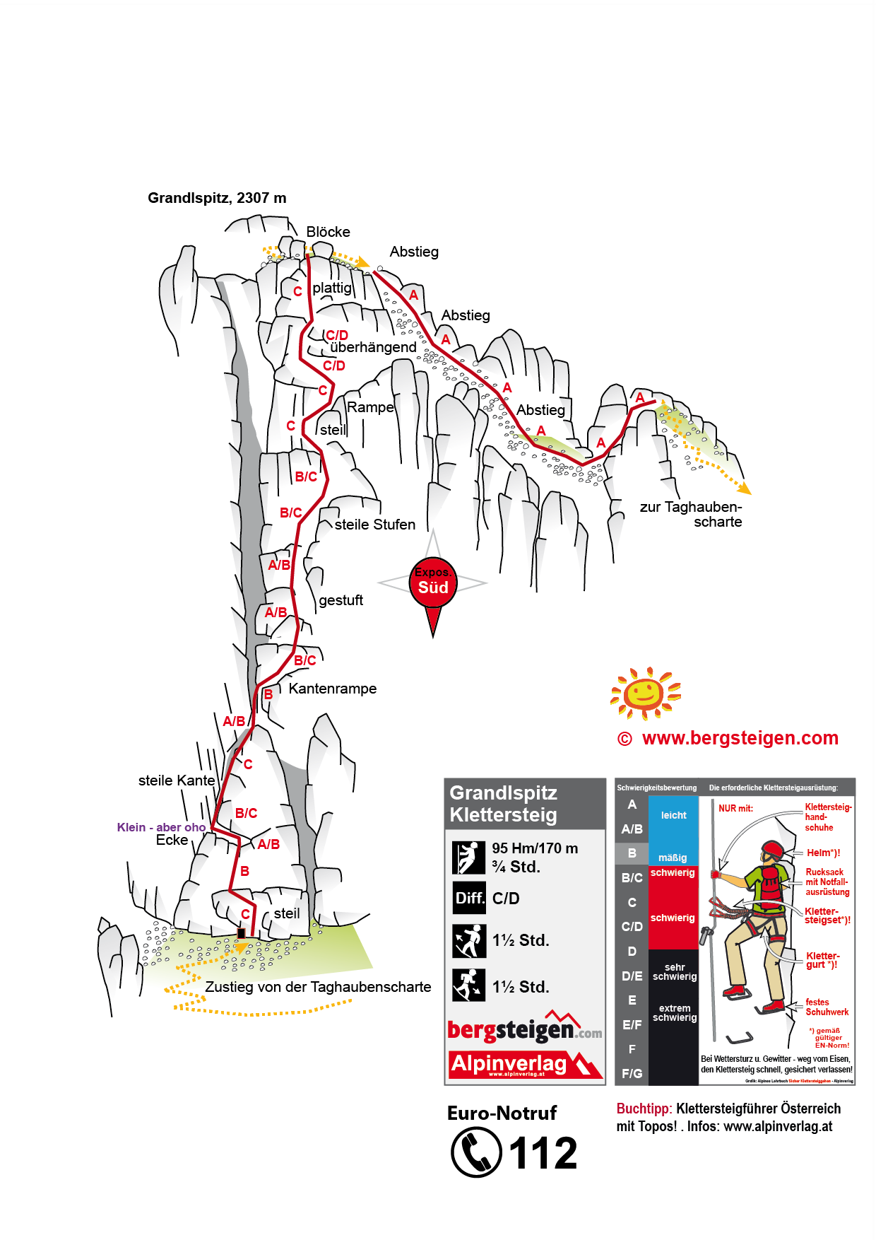 Schöner Klettersteig, den man sehr gut am Tag der Anreise in Angriff nehmen kann, um sich für den Königsjodler einzuklettern. Der kühn angelegte Steig, mit ca. 170 Klettermetern, führt durch die Südwand des Grandlspitzes und ist im oberen Teil anspruchsvoll und ausgesetzt. Interessant ist der Klettersteig in Kombination mit einer Besteiung der Taghaube - wird sehr gerne als Rundtour gemacht.