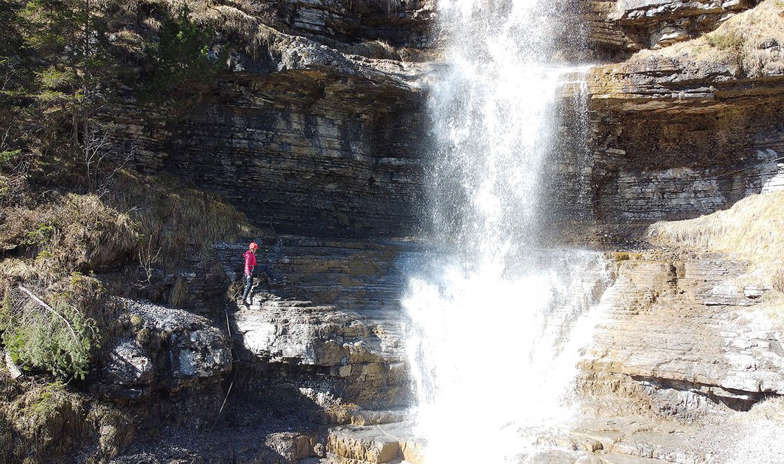 Siehe Topo, dieses gibt es vorab für Besitzer der TourenApp bei den Klettersteigführern Österreich bzw. Deutschland. Die Route unter dem Wasserfall ist B, nur die nicht verpflichtenden vertikalen Passagen im kleinen Steinbruch sind C bzw. C/D.