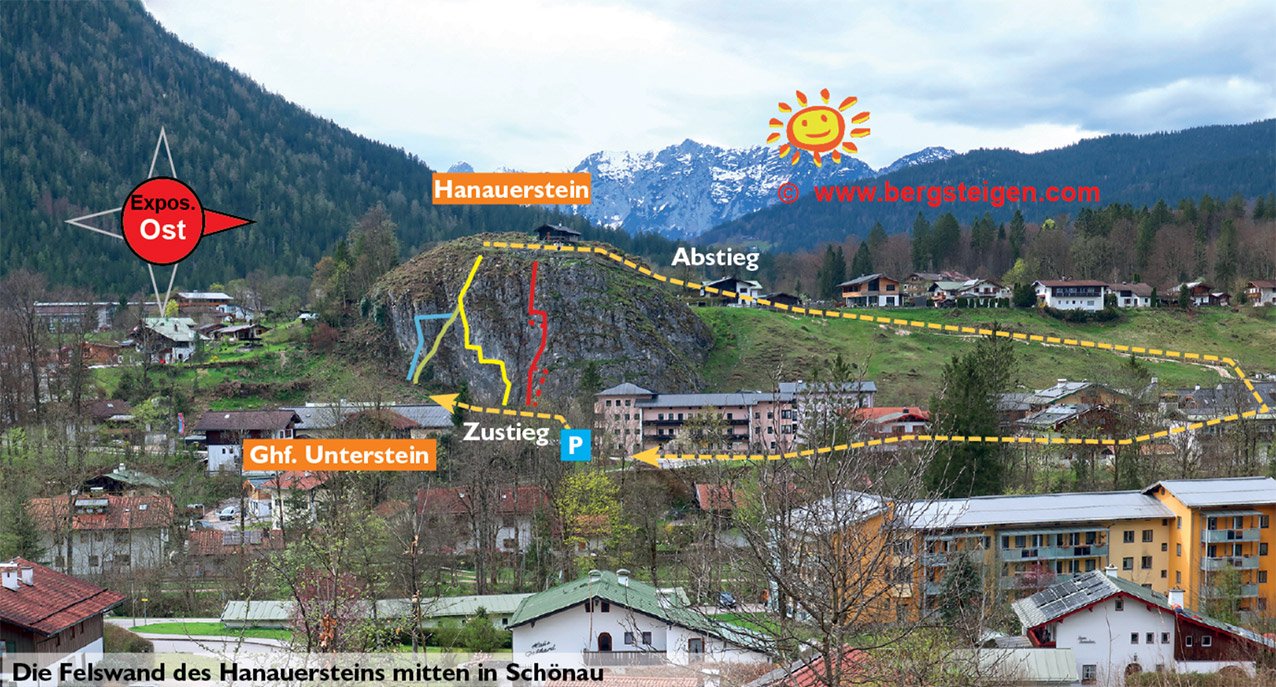 Der Übungsklettersteig Hanauerstein liegt direkt beim Gasthaus Unterstein und ist aufgrund eines kurzen Zustieges (1 Minute) die ideale Ferrata für kletterhungrige Zustiegsverweigerer. Obwohl der Steig zur Klettersteigschule Berchtesgaden gehört, darf er dennoch von Privatpersonen begangen werden.