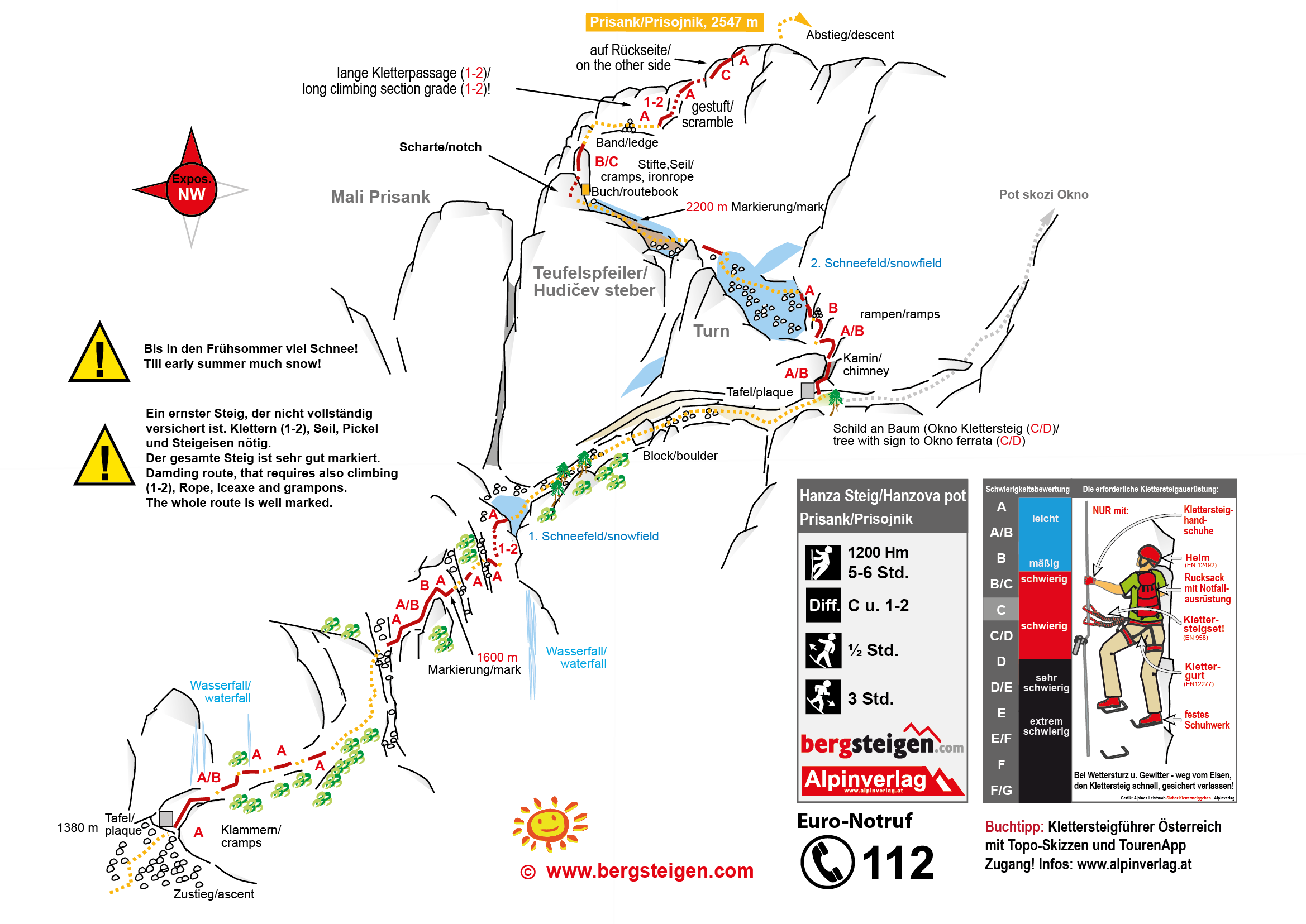 Der Hanzasteig, auf slowenisch Hanzova Pot genannt, ist ein fantastischer alpiner Weg, der viel alpinistisches Können abverlangt. Es handelt sich hier also um keinen klassischen Klettersteig, sondern um einen alpinen Steig, der an den schwierigsten oder ausgesetztesten Stellen mit Drahtseilen oder Eisenstiften versichert wurde. Aufgrund seiner nordwestseitigen Lage und Anlage am Fuße von mächtigen Felswänden liegen bis in den Sommer hinein Schneefelder in den Karen und Rampen, die nicht umgangen werden können. Geeignete Ausrüstung in Form von Eispickel und Steigeisen sowie deren korrekte Verwendung sind Voraussetzung für eine sichere Begehung.