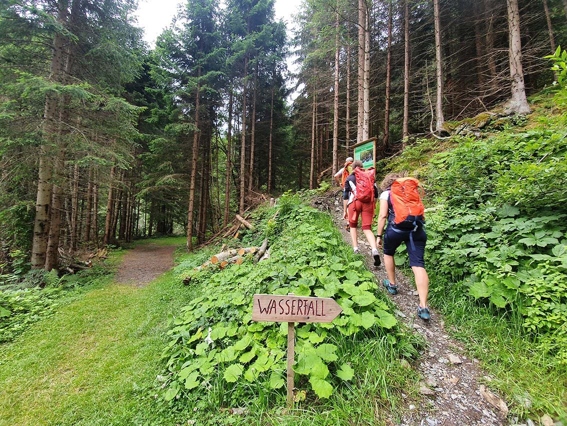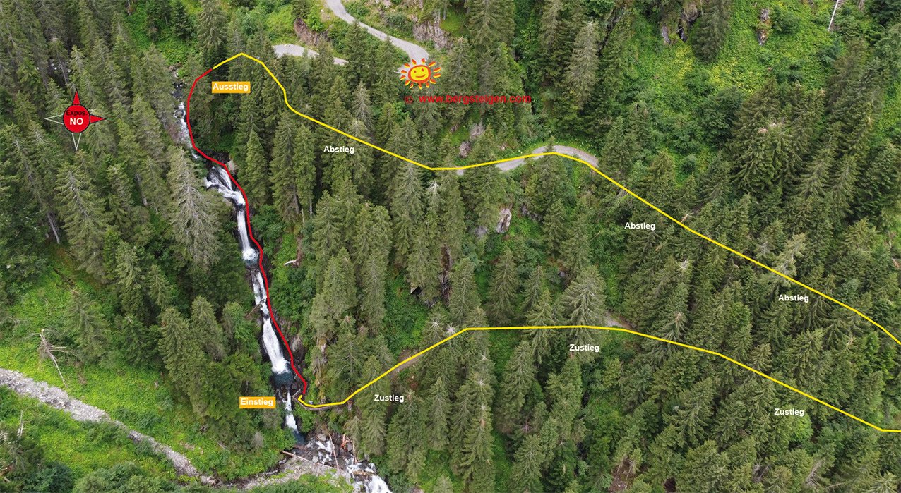 Vom Parkplatz bei der "Bienentankstelle" auf dem Schotterweg taleinwärts. Bei einer Abzweigung rechts in Richtung Wasserfall/Goldcamp. Beim Goldcamp verlässt man die Schotterstraße und geht auf dem Weg gerade weiter, zweigt dann aber links aufwärts in Richtung Wasserfall ab. Man kommt zu einer Plattform direkt am Wasser, dort beginnt der Klettersteig.