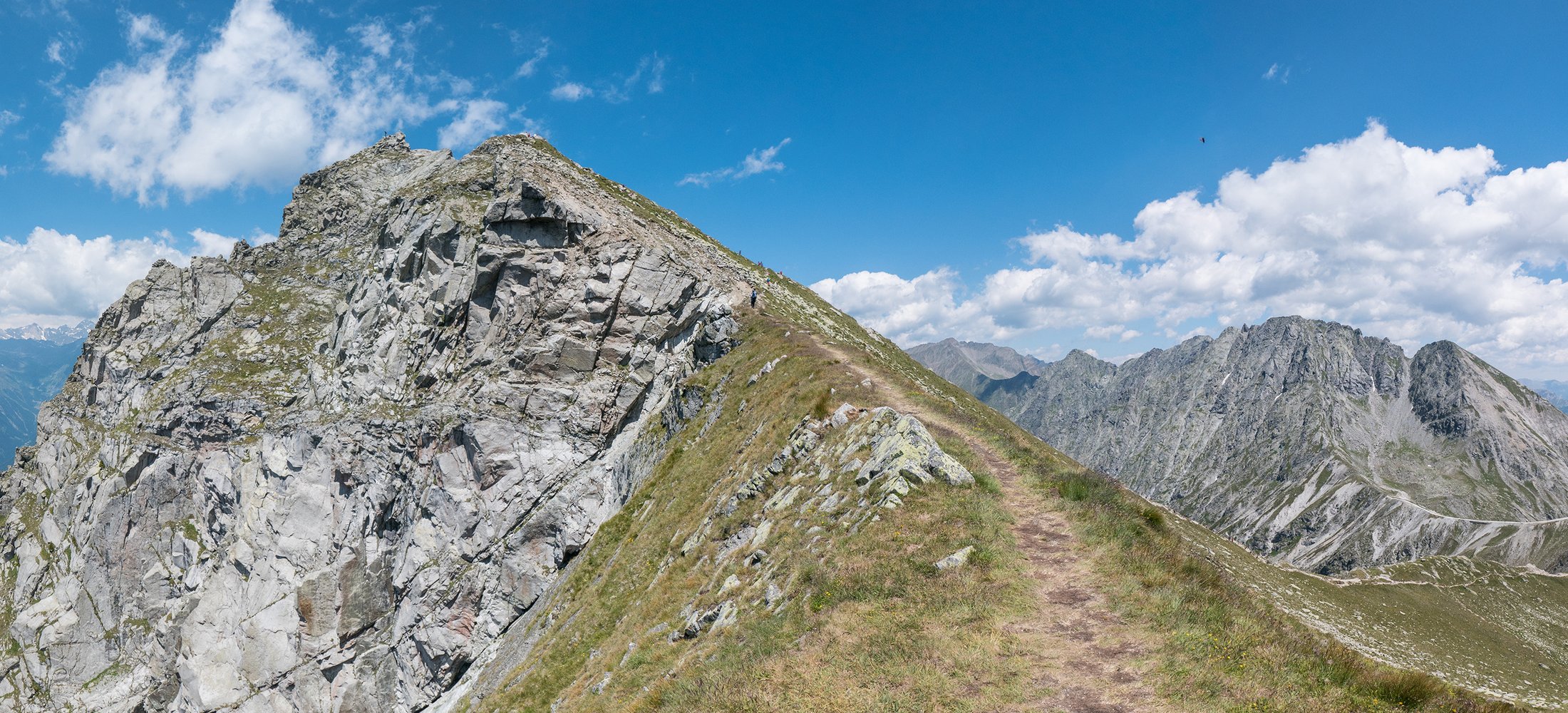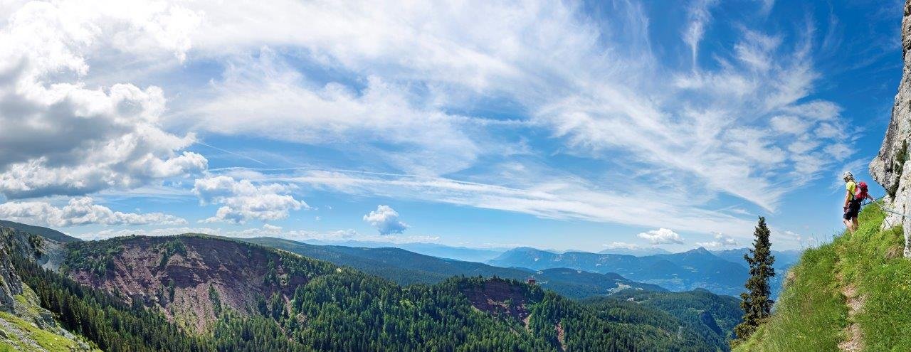 Siehe Topo: Von der Plattform über einen Aufschwung (B/C) zu einem Grasband (A). Nach links zur nächsten Stufe (B/C - evtl. auch C), nach einer Flachpassage erreicht man das Steilstück (B/C; „Edelweiß“). Danach leichter (B) über Felsstufen zum sog. Dolomitenpanorama. Auf steilem Gras höher bis zum Beginn (B) des „Geistergrates“ (A/B und B). Man kommt an ein paar Bäumchen vorbei „Waldele“ und erreicht (A) den Heini-Holzer-Rastplatz (Bank). Der Steig wird ab dort leichter und hat längere Gehpassagen Vorbei am Platz mit dem Steigbuch und hinauf zum Spalt (B), nach der Kante „Engelskante“ weiter zum Ausstiegsgrat (eine Stelle B, sonst leichter). Das Ende des Klettersteiges ist auf 2495 m auf einer großen Tafel angezeigt (breiter Wiesengrat).