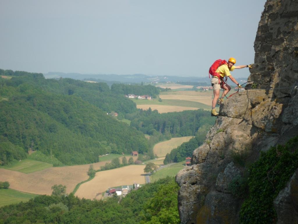 Aus der lieblichen südsteirischen Weingartenhügelgegend ragt ein steiler vulkanischer Monolit heraus, dessen Gipfelplateau fast vollständig mit der Riegersburg verbaut ist. Durch die Südwestwand führen zwei nette und großteils leichte Klettersteige, die direkt im Gastgarten der Burgtaverne enden, wo man ganz standesgemäß am Ende der Versicherungen mit einer Glocke nach dem Kellner bzw. nach einem Bier läuten kann.