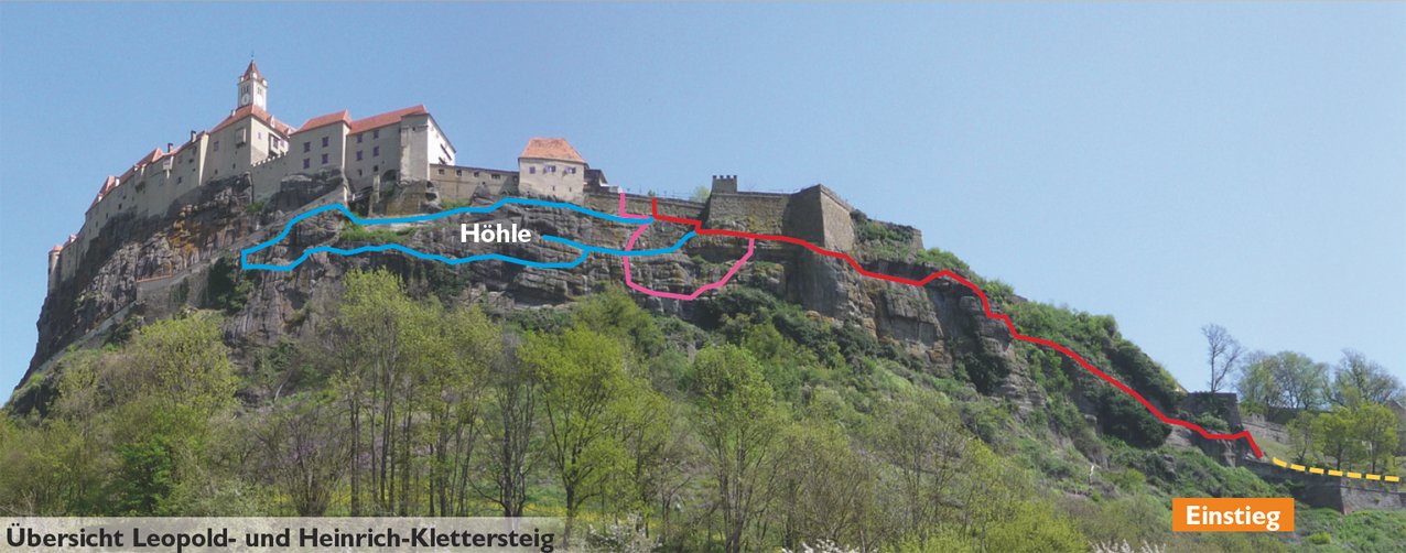 Siehe Topo-Skizze. Der Heinrich-Klettersteig kann nur über den Leopold Klettersteig oder durch den Abstieg vom Gastgarten der Burgtaverne erreicht werden. Am Ende des Leopold-Klettersteigs hängt man dann einfach über die Friedrich-Höhle den Heinrich-Klettersteig (C) an. Beim Geländer vor der Friedrich-Höhle zweigt eine kurze Variante (D) nach unten hin zum Leopold-Klettersteig ab - bitte die Einbahnschilder beachten!