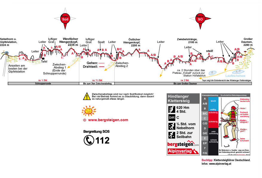 Anspruchsvolle und sehr lange Klettersteigtour für geübte Klettersteiggeher. Nicht alle Steilpassagen sind mit Drahtseilen und Leitern abgesichert. Es gibt zwei Notabstiege, jeweils in Scharten. Einer ist nach dem Westl. Wengenkopf (für Schnupperrunden-Geher), der zweite kurz vor dem Östlichen Wengenkopf (siehe Topo) - auf keinen Fall auf die Nordseite absteigen! Schnupperrunde: Auch nur für Geübte zu empfehlen - für Anfänger und älte Kinder (Tour ab 14 Jahren empfohlen) auf jeden Fall ein Sicherungsseil einpacken (siehe Bilder; tlw. ausgesetzt).