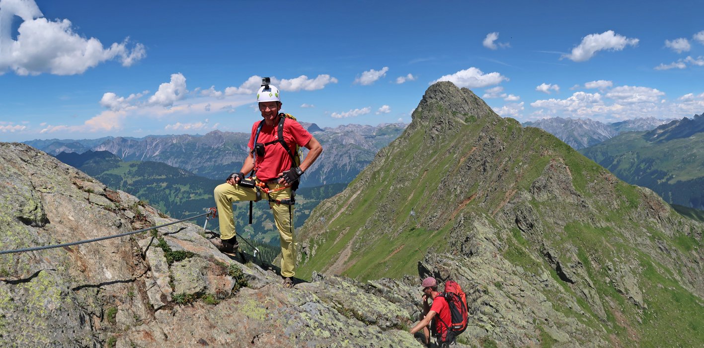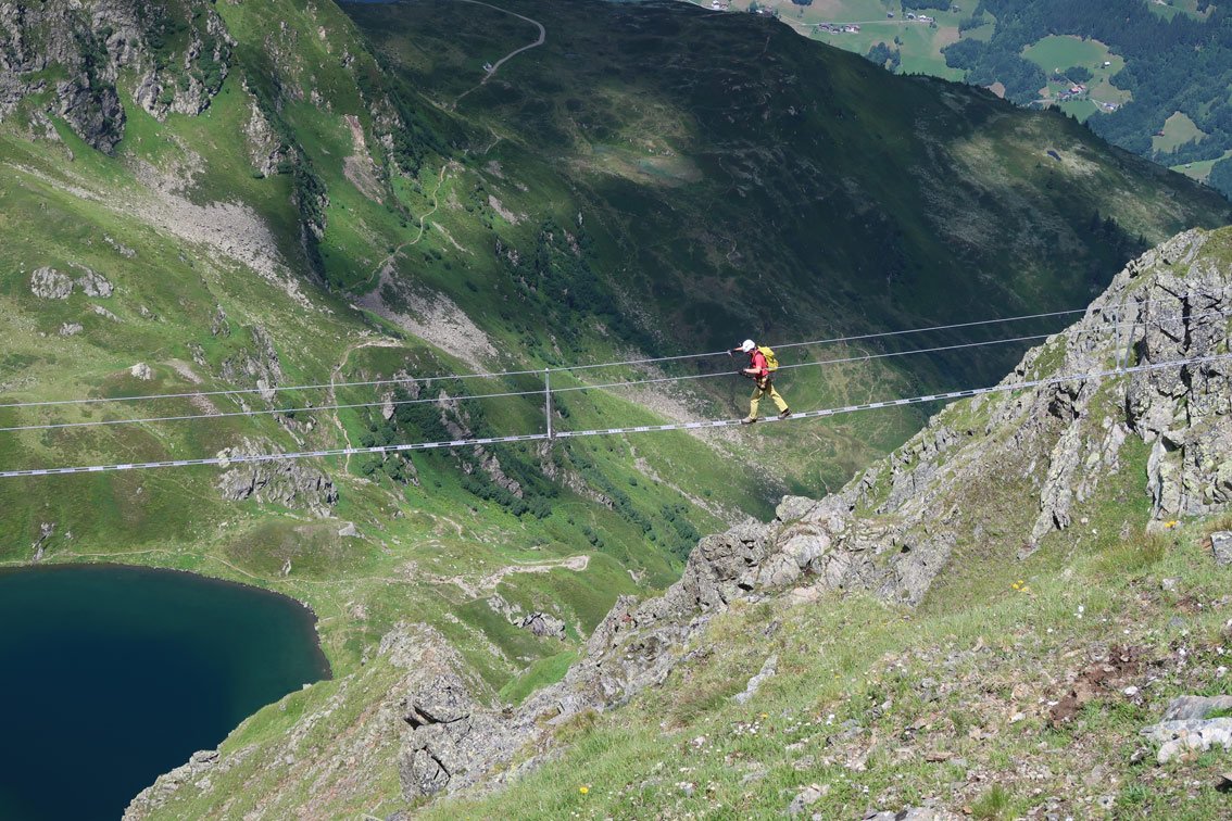 Eine gewaltige Seilhängebrücke mit Rätikon-Panorama - wo man das findet? Am Hochjoch oberhalb von Schruns ist ein konditionell fordernder Klettersteig angelegt worden, bei dem die Seilhängebrücke das „Grande Finale“ darstellt. Wer nicht so klettersteigversiert ist, kann den Hochjochgipfel auch über den zweiten Teil (Abstieg) des Klettersteiges erreichen und die 62 Meter lange Hängebrücke quasi als Gipfelrunde mit einbauen.