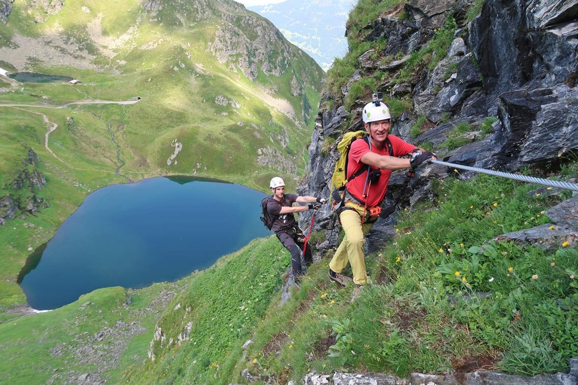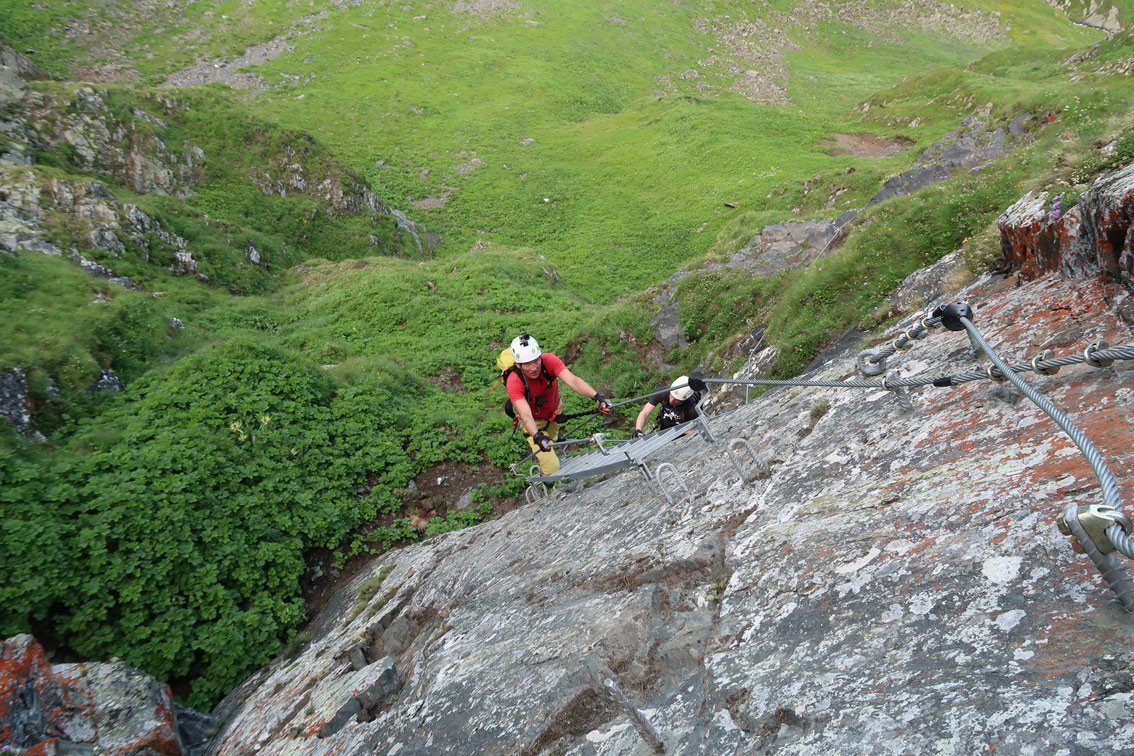 Achtung: Es gibt viel erdige Passagen, bei Nässe ist von diesem Klettersteig abzuraten! Auch der Notabstieg (bei Lawinensprengmasten) ist steil und bei Nässe heikel. Gesamt eine lange Klettersteigrunde (ca. 1700 Meter Stahlseil!), bei der man die Wetterentwicklung genau im Auge behalten sollte! Infos Bergbahn: www.silvretta-montafon.at Beim Zustieg beim Kälbersee gibt es noch die Kälbersee Klettersteige (B bis C/D, 60 Hm, ½ Std.), siehe Topo und App. Diese sind als Übungsklettersteige bzw. bei unsicherem Wetter interessant. Infos Bergbahn: www.silvretta-montafon.at
