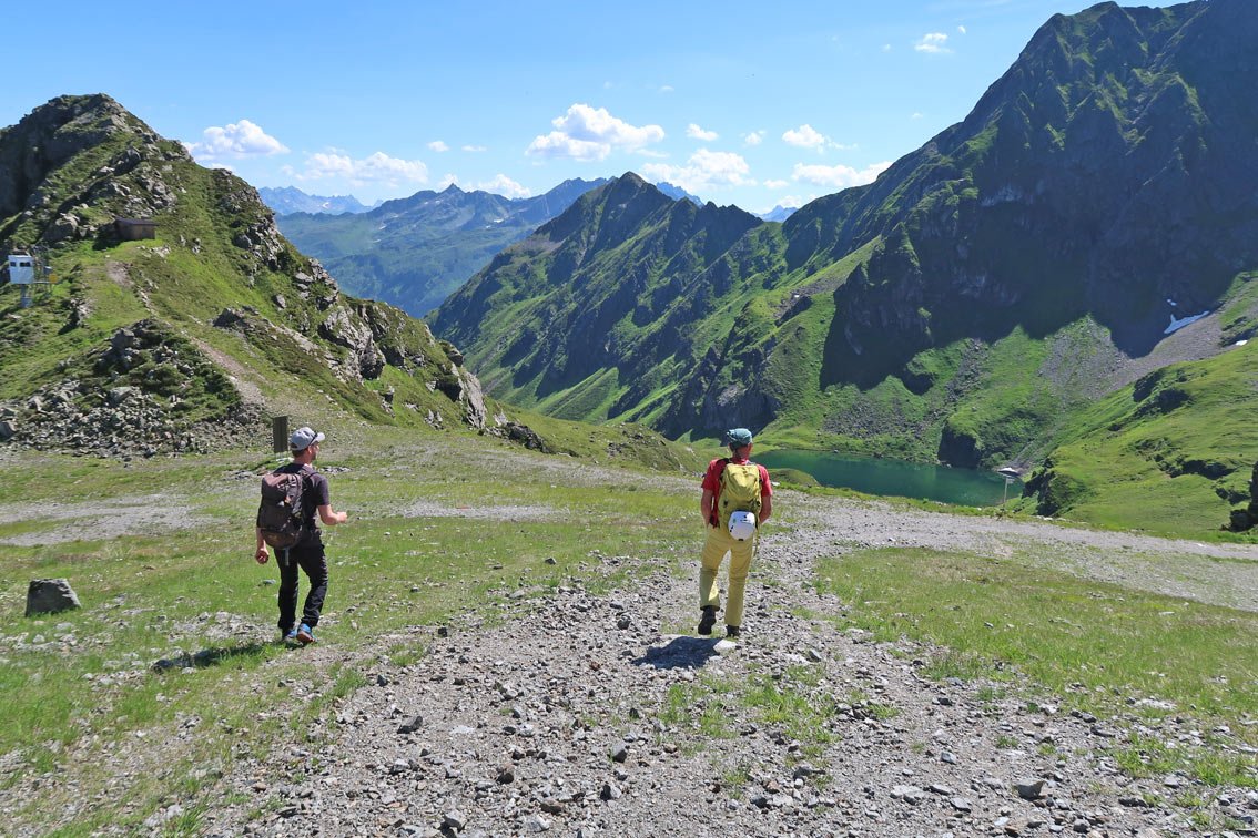 Alternativ kann man auf dem Schotterweg zum Seetalhüsli absteigen und von dort durch den Skitunnel hinuter zur Bergstation der Hochjochbahn gehen. Mehraufwand ca. ½ bis ¾ Stunden.