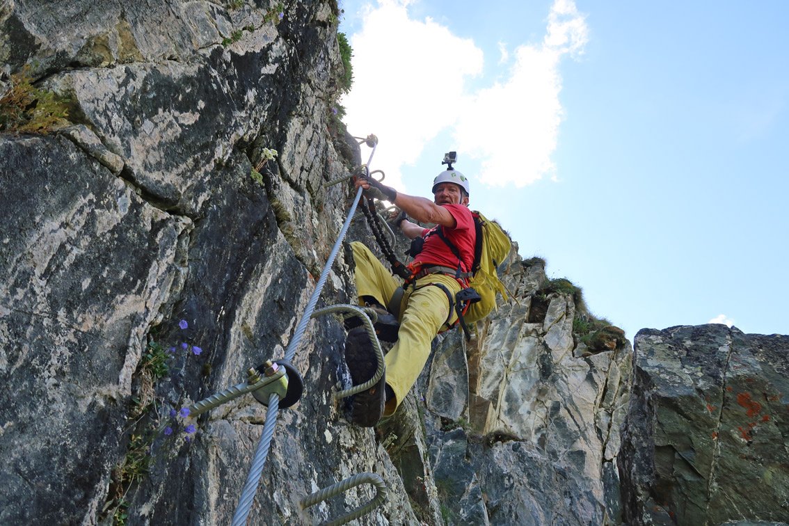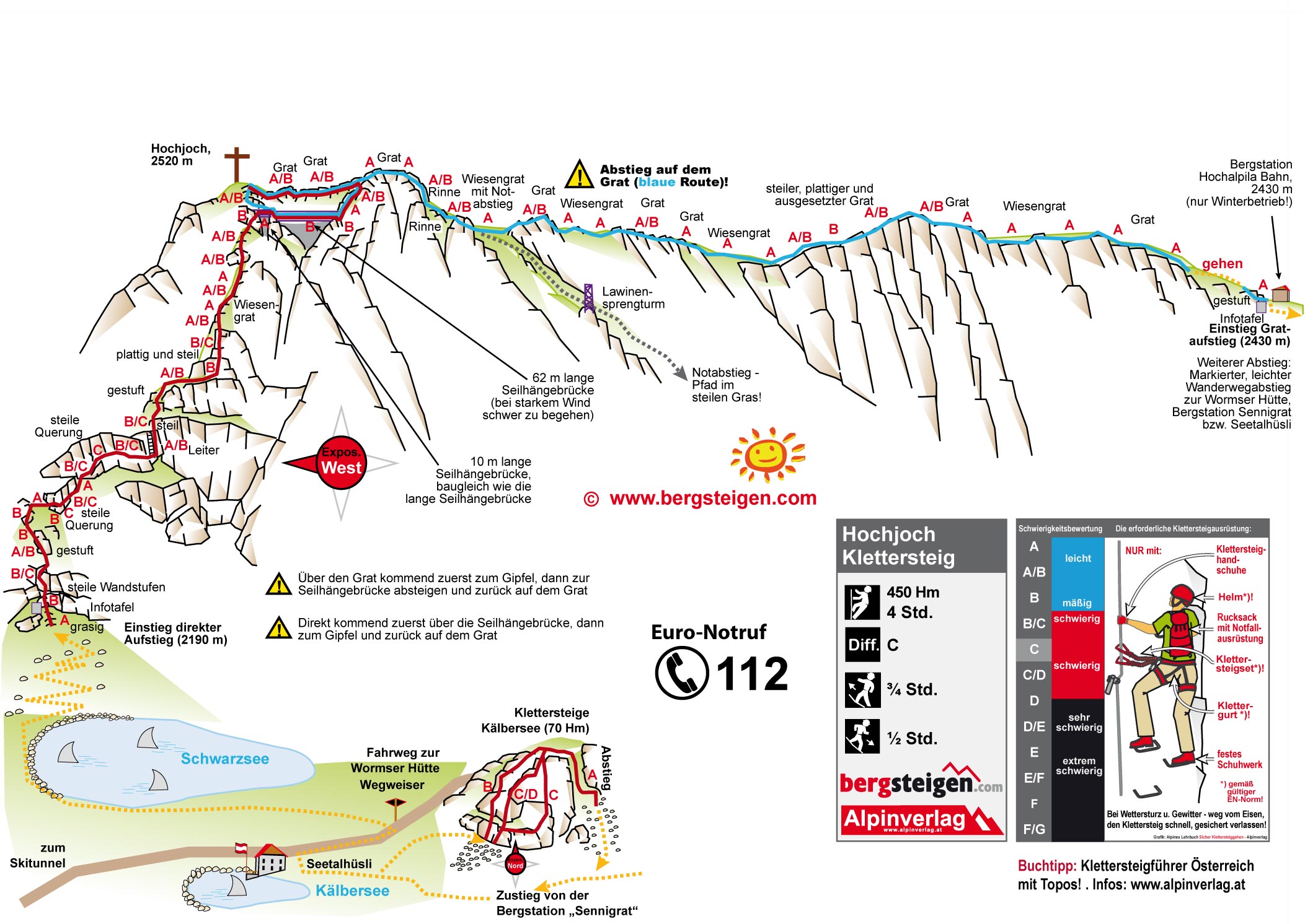 Siehe Topo. Vom Einstieg aus klettert man am durchgehenden Stahlseil bis auf den Gipfel des Hochjochs. Zwei steilere Querungen (C) fordern dabei einiges an Kraft und Kondition. Der Steig wird nach oben hin leichter, was sehr angenehm ist. Der Abstieg vom Hochjoch-Gipfel erfolgt auf dem sog. Hochalpila Grat (eine kurze, etwas ausgesetzte Passage B). Der Teil des Klettersteiges auf dem Hochalpila Grat wurde so angelegt, dass dieser auch im Aufstieg von schwächeren Gehern bewältigt werden kann - die 62 m lange Seilhängebrücke kann man als Variante so auch mit einbauen.