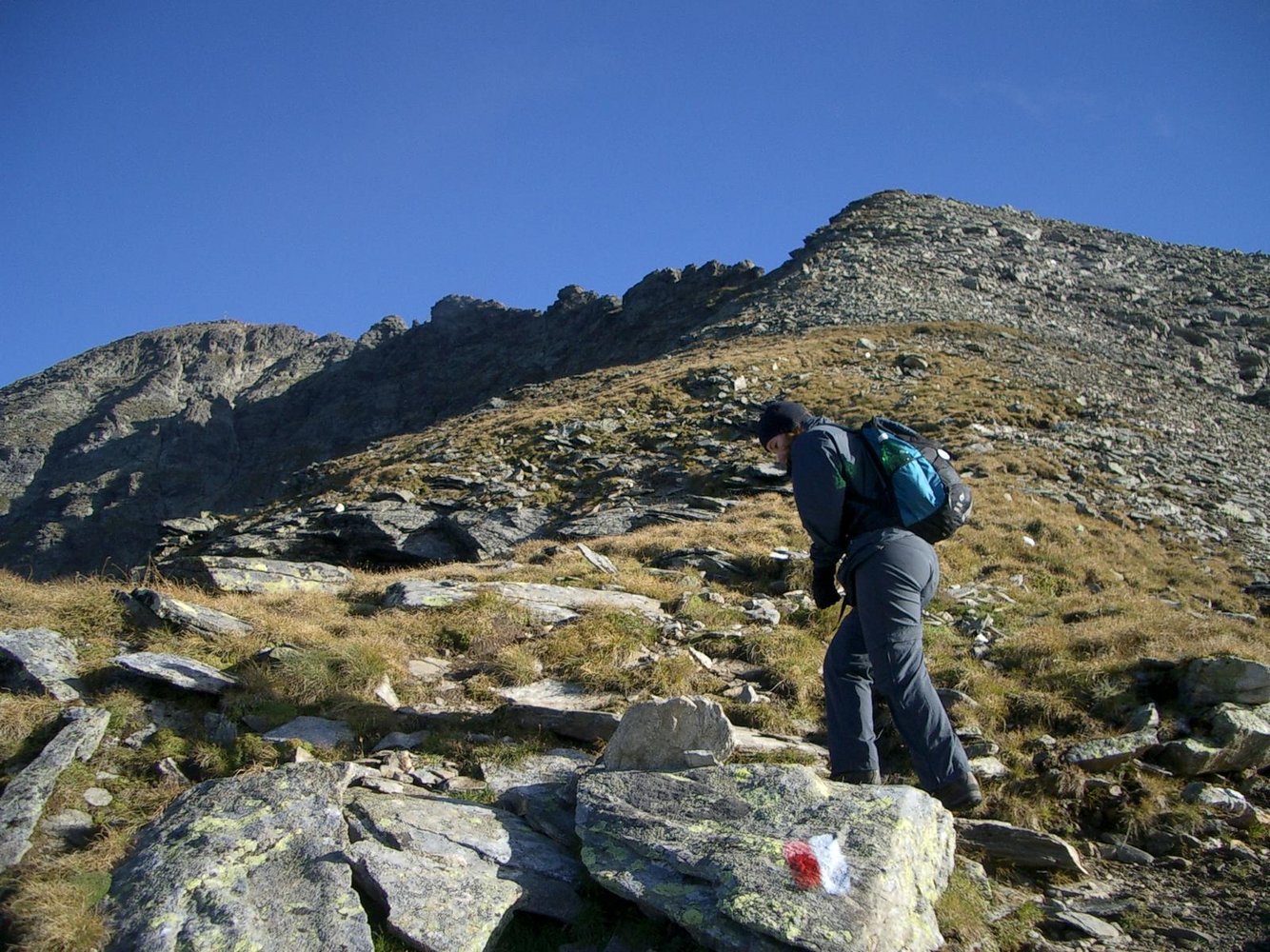 Vom Einstieg über leichte Kletterei (1) und ausgesetztes Gehgelände zu den ersten Versicherungen. Die folgende, mit Eisenklammern versicherte und sehr ausgesetzte Wandstufe (B/C) stellt die Schlüsselstelle dar. Über Gehgelände (Grat stellenweise sehr schmal) geht es zur nächsten Wandstufe. Diese ist mit einigen Eisenklammern versichert (B, dann A/B). Direkt am Grat geht es in leichter Kletterei (1) weiter hinauf. Nach einem Stück Gehgelände folgen noch einige Kletterstellen (1+) bevor der Gipfel erreicht wird.