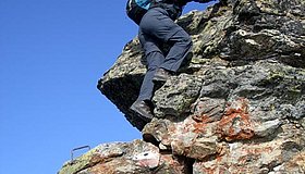 Nur wenige Versicherungen in Form von Eisenklammern, kein Stahlseil. Eine Selbstsicherung ist nur ganz vereinzelt möglich.
