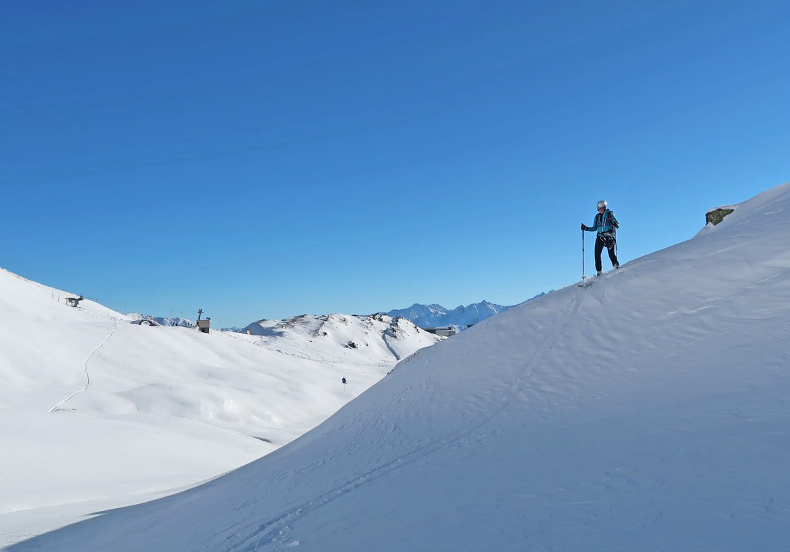 Vom Ausstieg oben rechts hinunter zur Zustiegsspur und dann zurück zur Skipiste.