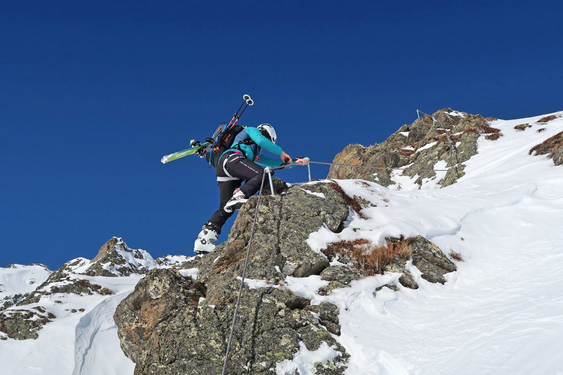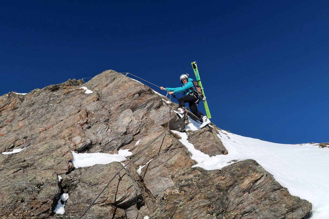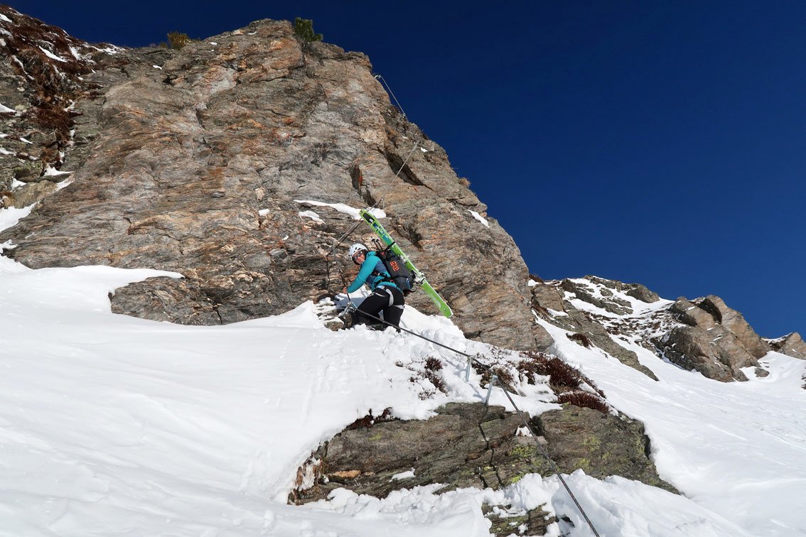 Gut mit Stahlseil und wenigen Trittklammern abgesichert.