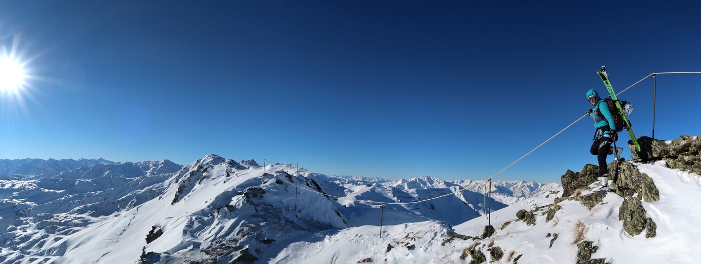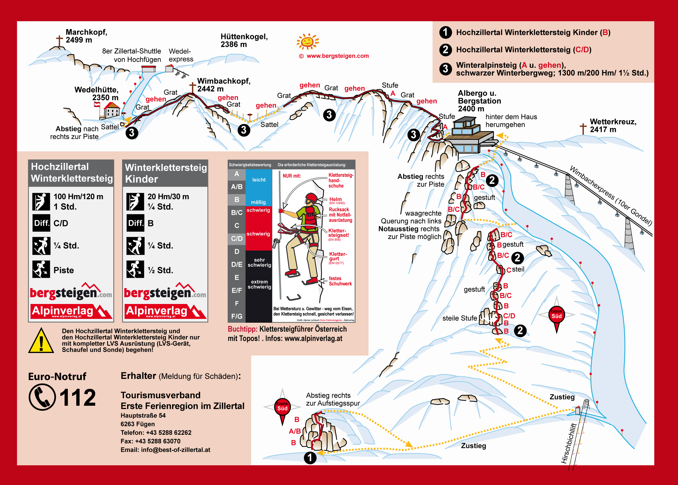 Jetzt hat auch das Zillertal seinen Winterklettersteig. Eingebettet in das Skigebiet Hochzillertal wurde eine südseitige Ferrata geschaffen, bei der man über mehrere steile Kurzaufschwünge hinauf zur Bergstation klettert. Unterhalb des Winterklettersteiges wurde links an einem Felsen eine ca. 20 Meter hohe Kinderferrata (B) gebaut, diesen Winterklettersteig für Kinder kann man vor der längeren Ferrata zum Aufwärmen machen. Von der Bergstation des Wimbach-Express leitet ein schwarzer Bergweg, der sogenannte Winteralpinsteig entlang des Grates zum Wimbachkopf (2442 m) und von dort hinunter zur Wedelhütte. Die Gesamtkombination dieser drei Touren ist lohnend und füllt einen halben Skitag sehr gut aus.