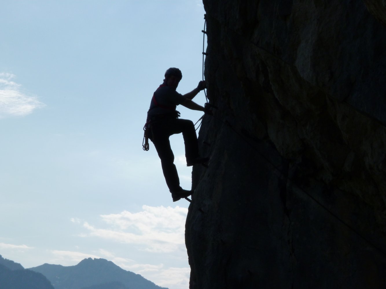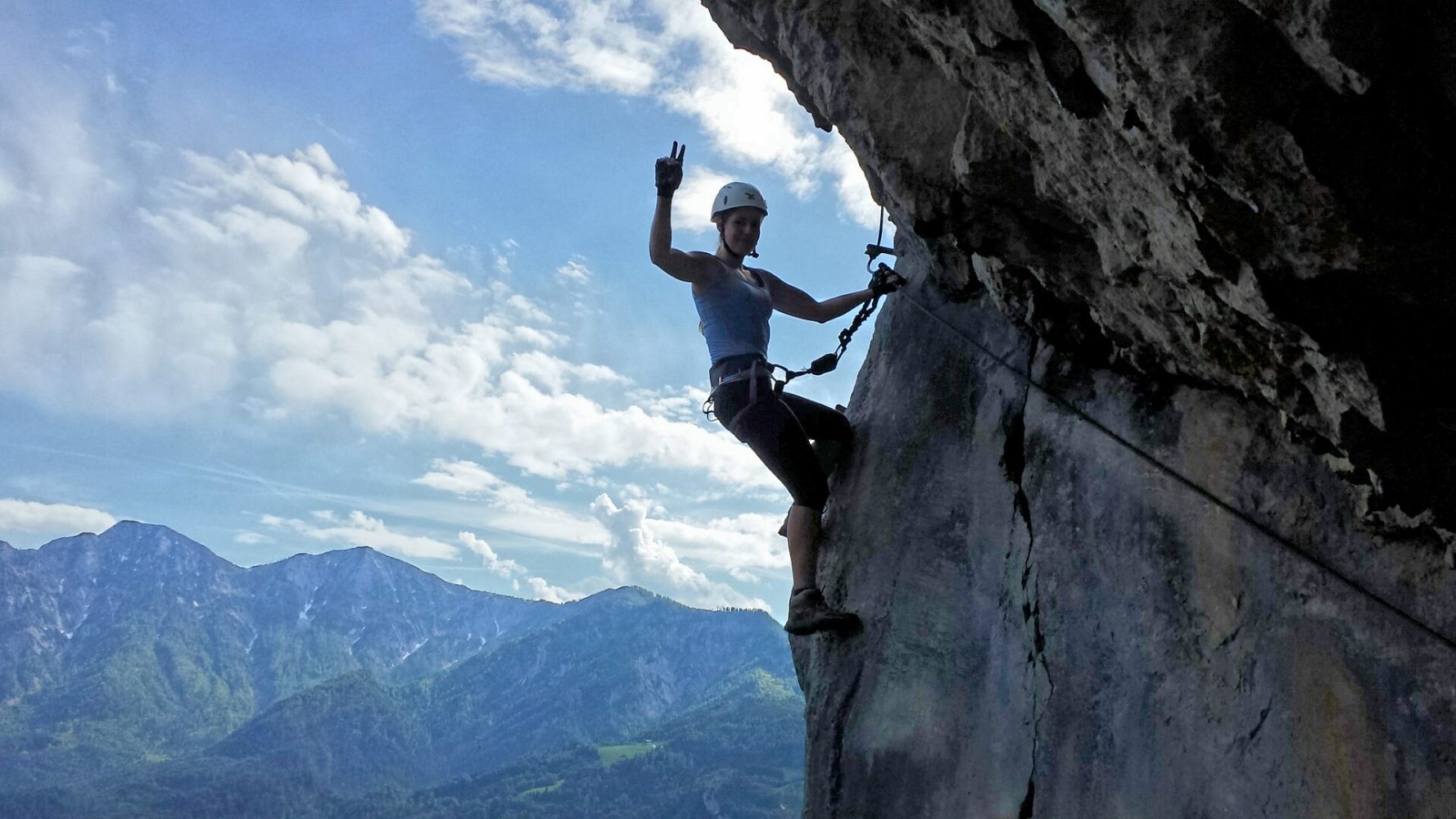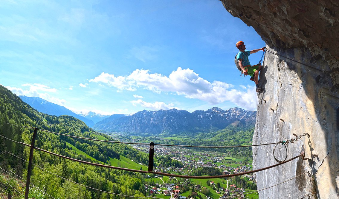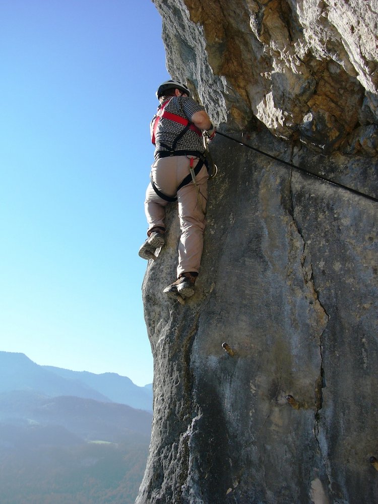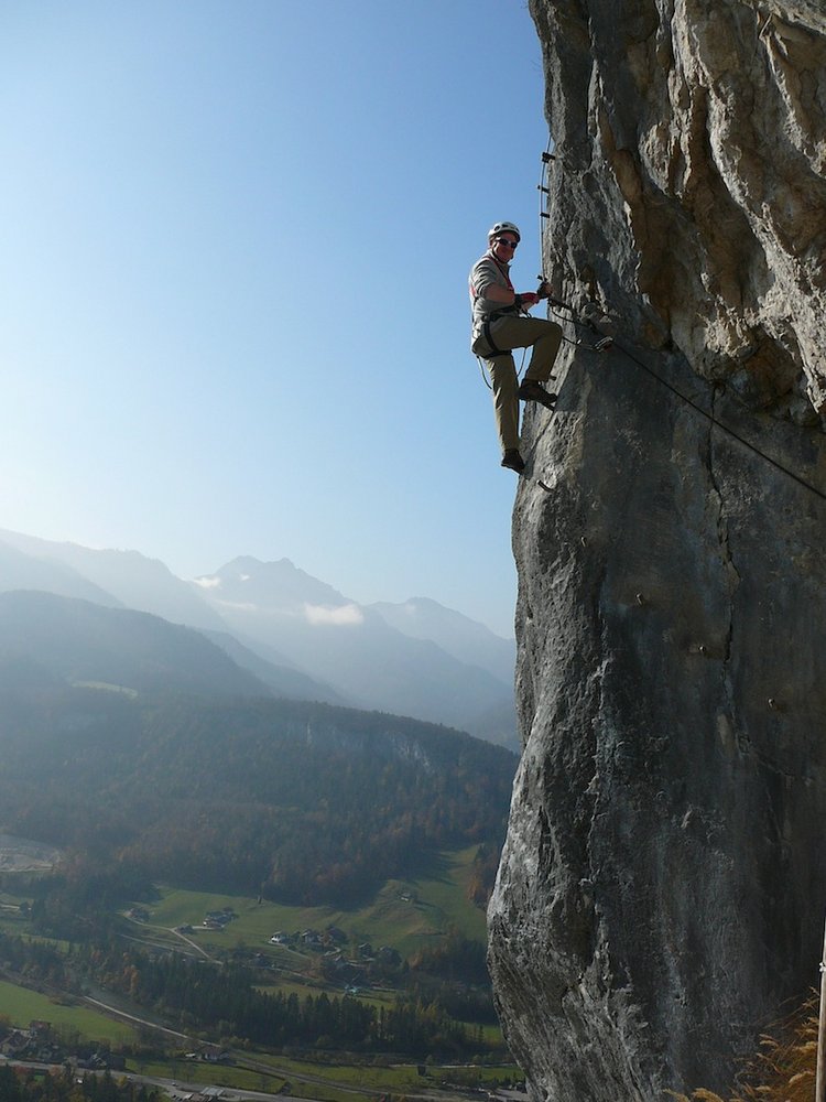Der Höhenweg Klettersteig (Ewige Wand) ist ein Klassiker oberhalb von Bad Goisern. Direkt vom Tunnel 2 des Höhenweges (eine in den Fels gehauene Straße) zieht diese Ferrata steil, aber nur mittelschwer an einer Kante hinauf. Oben dann plattig und gestuft zum Ausstieg. Gut mit dem darunter liegenden Josef Klettersteig zu kombinieren - toller Ausblick auf das Dachstein-Massiv.