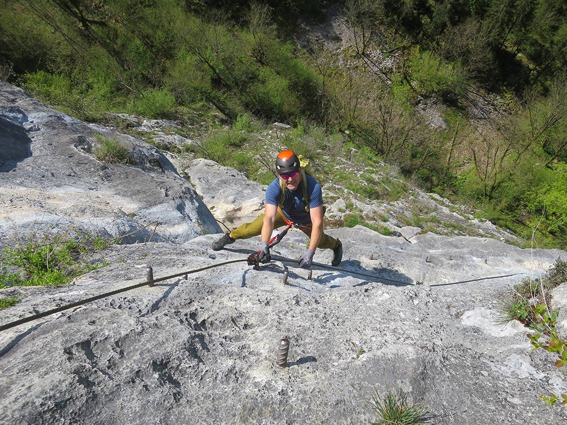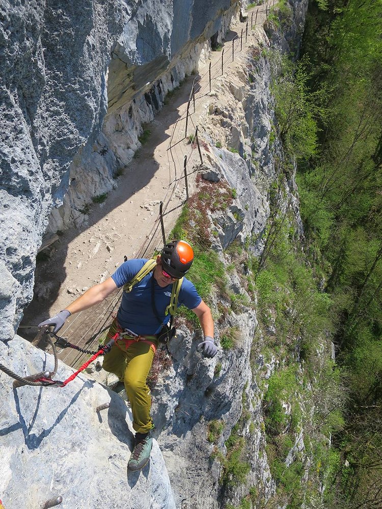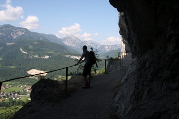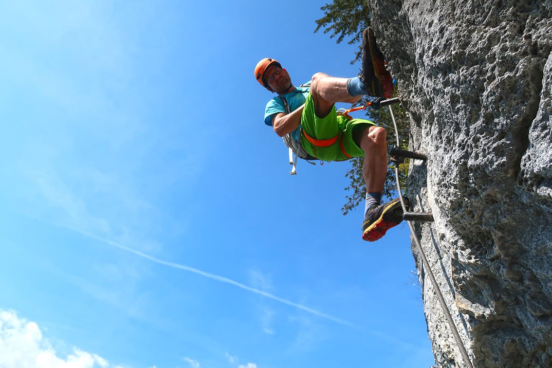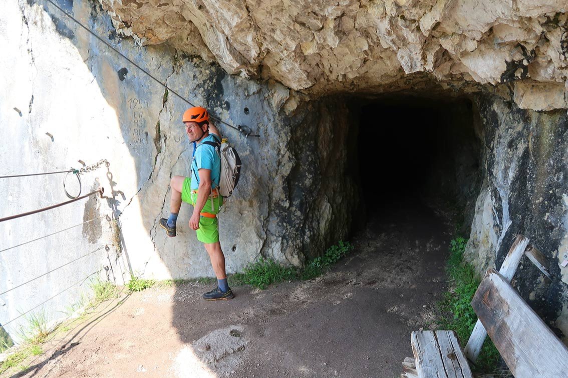 Wer schön einmal dort ist, kann den darunter liegenden Josef Klettersteig (C) gleich mitmachen. Man geht vor dem ersten Tunnel der Wand entlang abwärts zum Einstieg.
