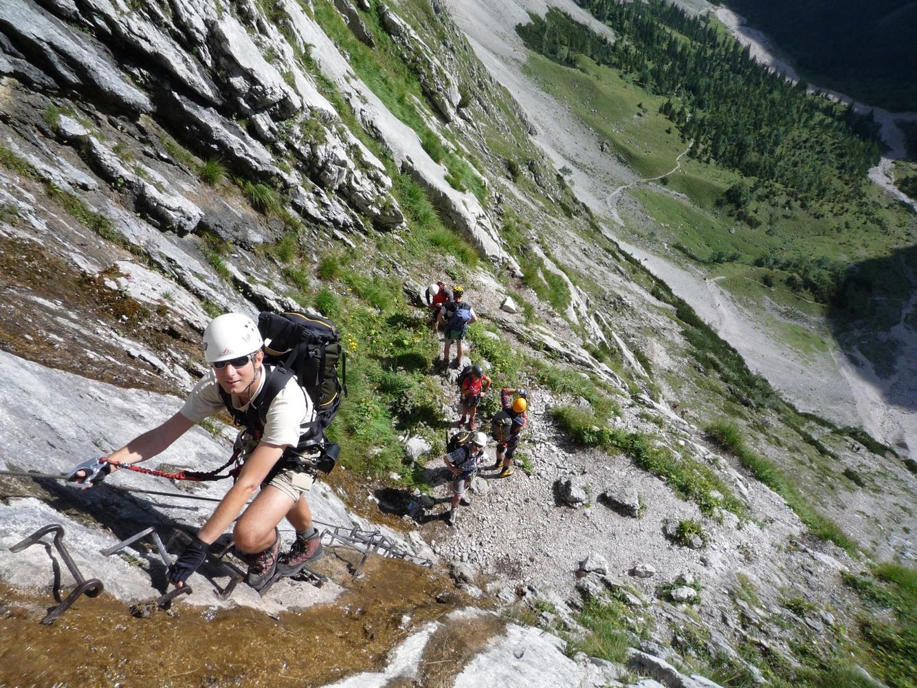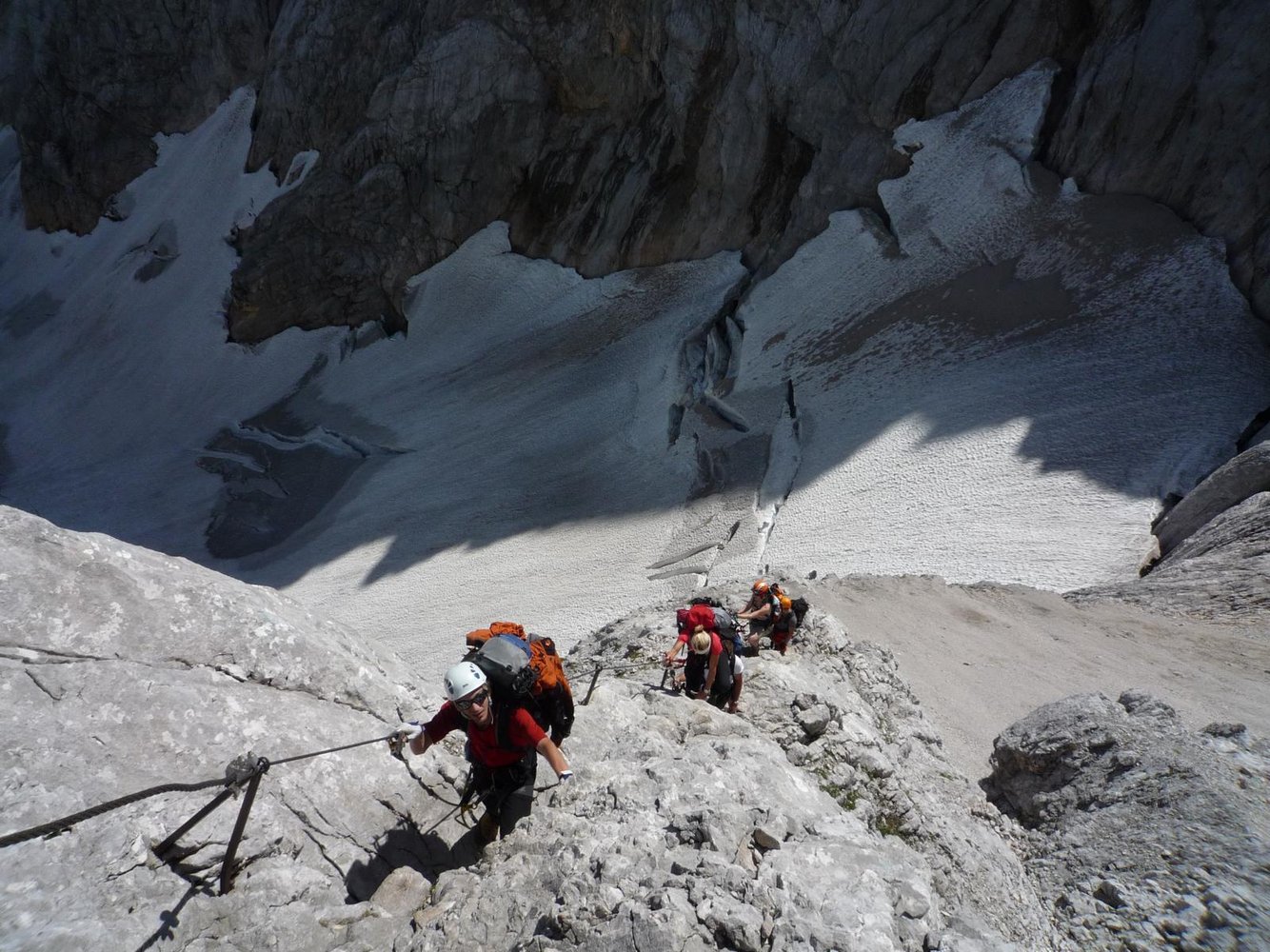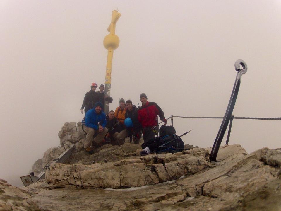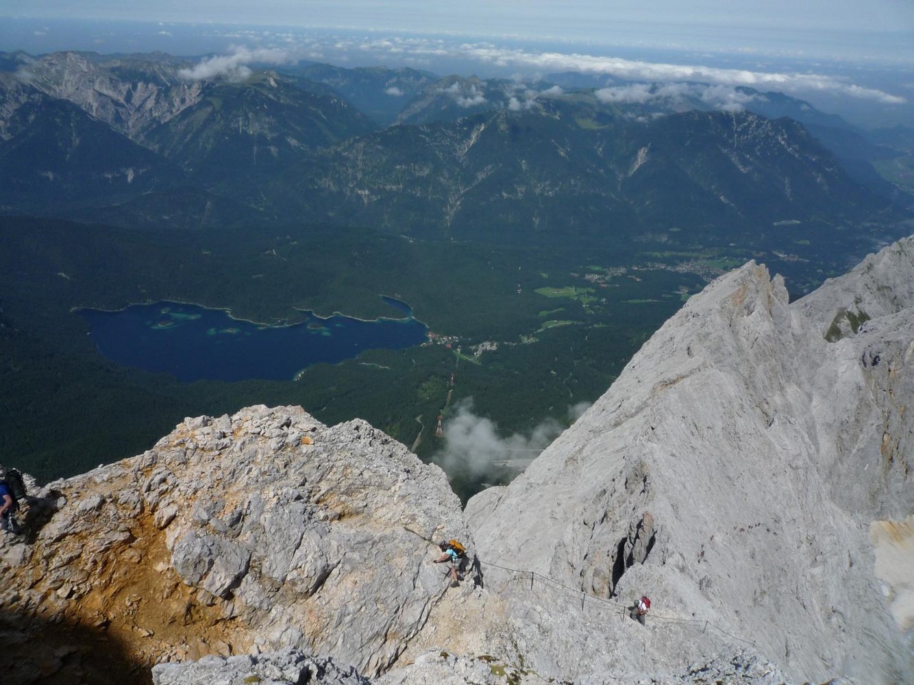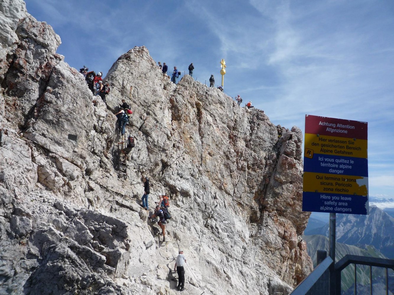 Der Klettersteig auf den höchsten Berg Deutschlands ist ein Abenteuer – und was für eines! Man taucht ein, in eine Mixtour aus landschaftlichem Hochgenuss beim Zustieg durch die „Wasserwelten“ der Höllentalklamm und vertikalem Drahtseilvergnügen, welches am sog. Brett seinen Anfang nimmt. Die Zugspitze hat wirklich alpines Flair zu bieten, das merkt man spätestens dann, wenn man an der Randspalte zum im Spätsommer recht weit entfernten Felsen hinüber muss. Dass man dem höchsten Punkt der Bundesrepublik recht nahe ist, spürt man dann an der recht mühsam laufenden „Pumpe“ auf den letzten Metern zum goldenen Gipfelkreuz. Schlussendlich bahnt man sich den Weg durch die an schönen Tagen erhebliche Touristenschar hinunter zur nahen Seilbahnstation, um dort an der höchsten Würstelbude Deutschlands den gewaltigen Tourentag mit Weißwurst und Bier würdevoll ausklingen zu lassen. Fazit: Imposante und sehr anspruchsvolle Klettersteigtour, die in keinem Tourenbuch fehlen darf.