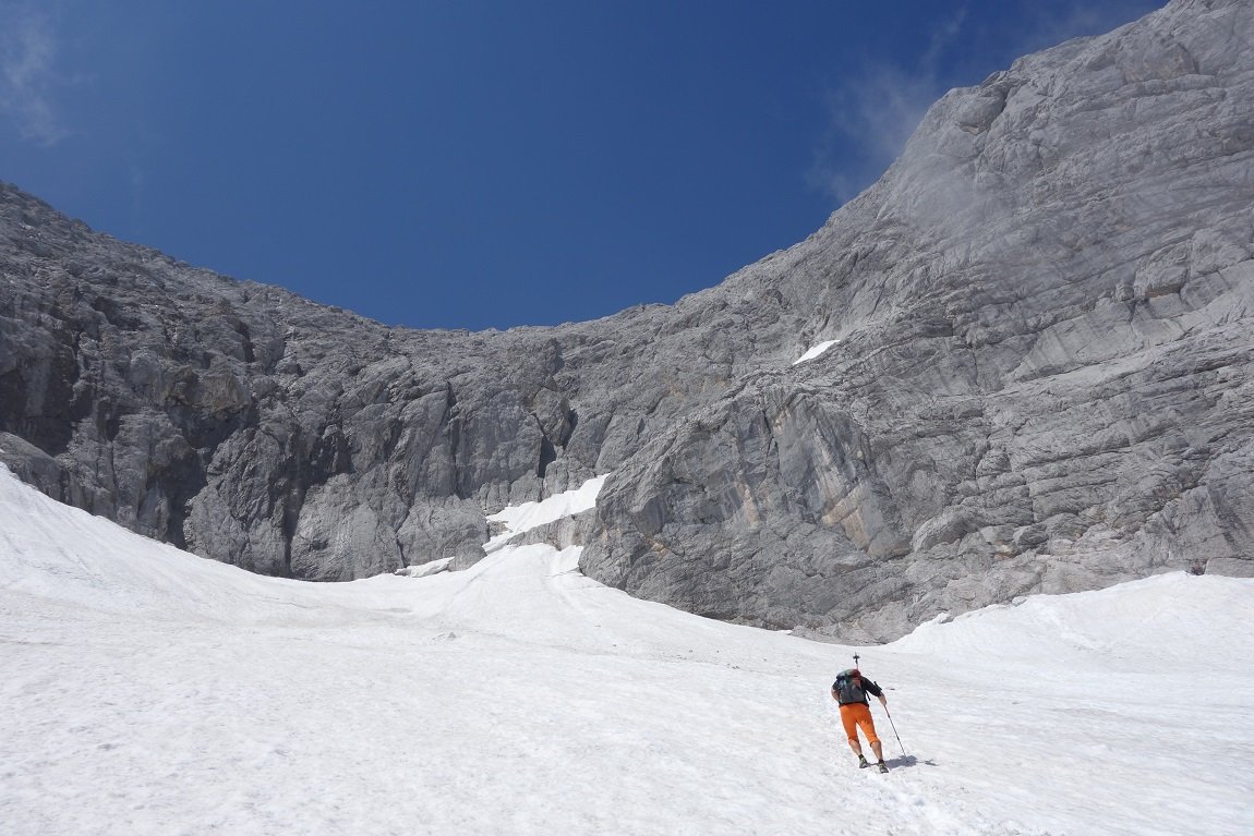 Diese Tour ist kein Sonntagsspaziergang. Der Höllentalferner ist das gefährliche Bindeglied zwischen Brett und Schlussanstieg – liegt viel Schnee auf dem Gletscher besteht Spaltensturzgefahr, ist der Gletscher nicht mit Schnee bedeckt, ist solides Gehen auf 30° steilem Blankeis gefragt (mit Steigeisen, Pickel und Seil muss man umgehen können).