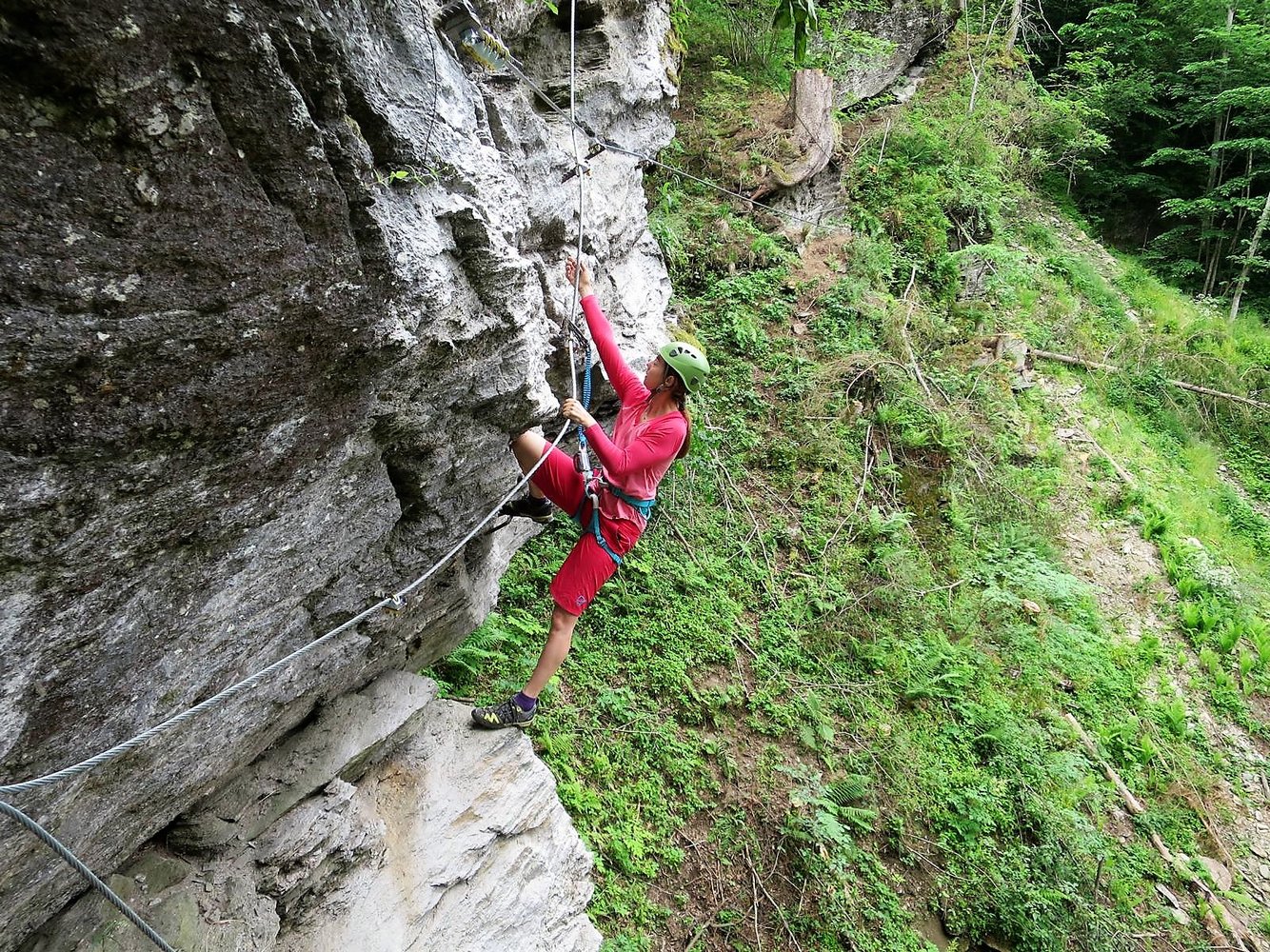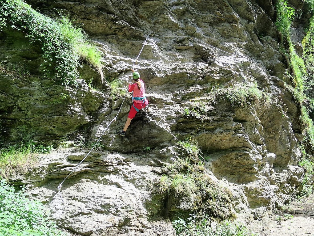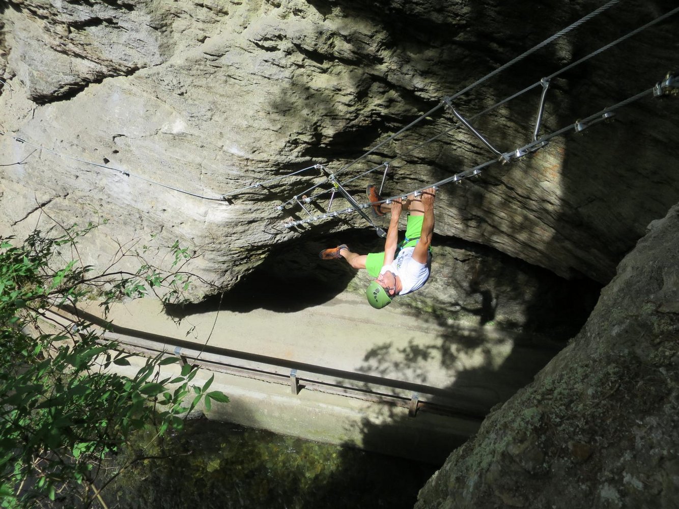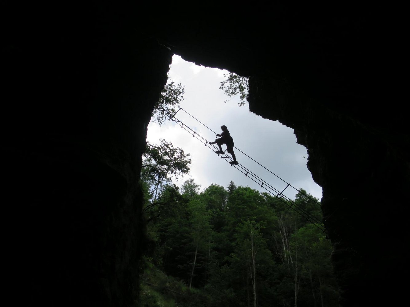 Wer den Notausstieg vor der oberen langen Steigbrücke nimmt, kann die Gesamtschwierigkeit auf C reduzieren.
