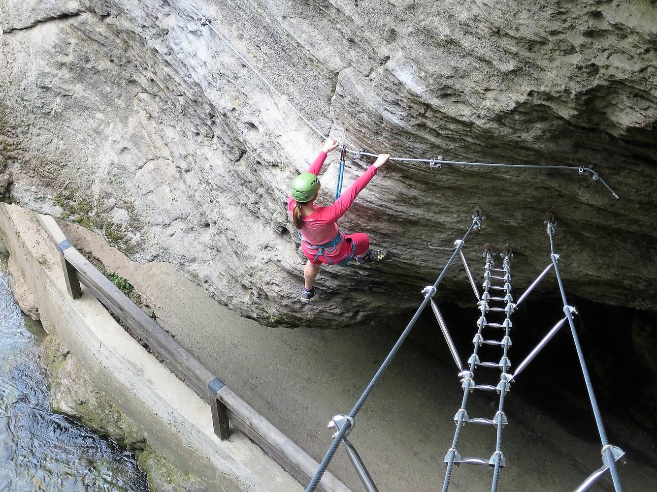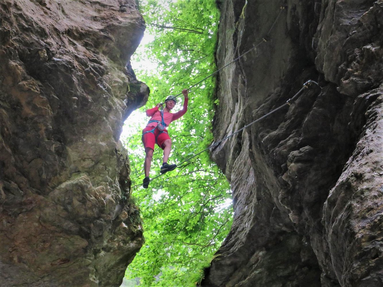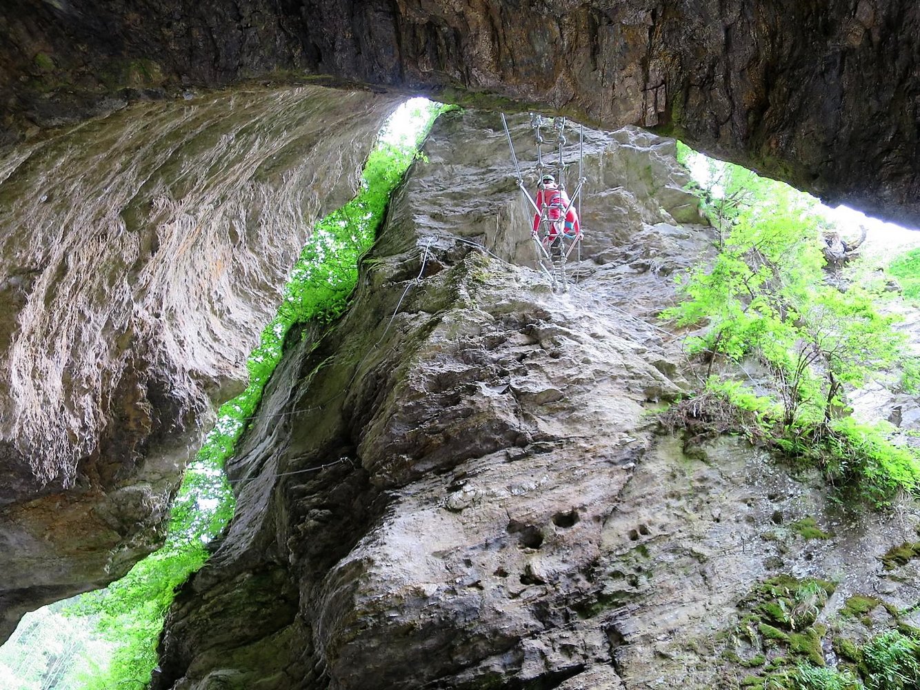 Wer den Notausstieg vor der oberen langen Steigbrücke nimmt, kann die Gesamtschwierigkeit auf C reduzieren.