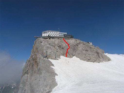 Unten bei der Hunerscharte geht man über Gletscher zu den Felsen rechts der Materialseilbahn, der Steigbeginn ist markiert.