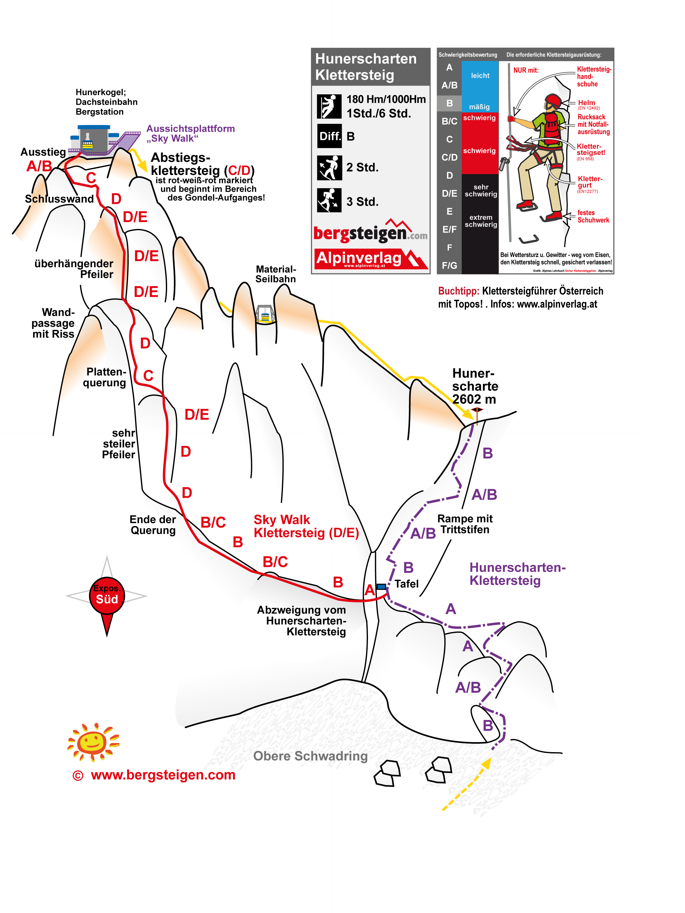 Von der Hunerscharte kann man auch über einen kurzen, aber schwierigen Hunerkogel Klettersteig (C/D) (rot markiert) direkt zur Bergstation der Südwandbahn gelangen.