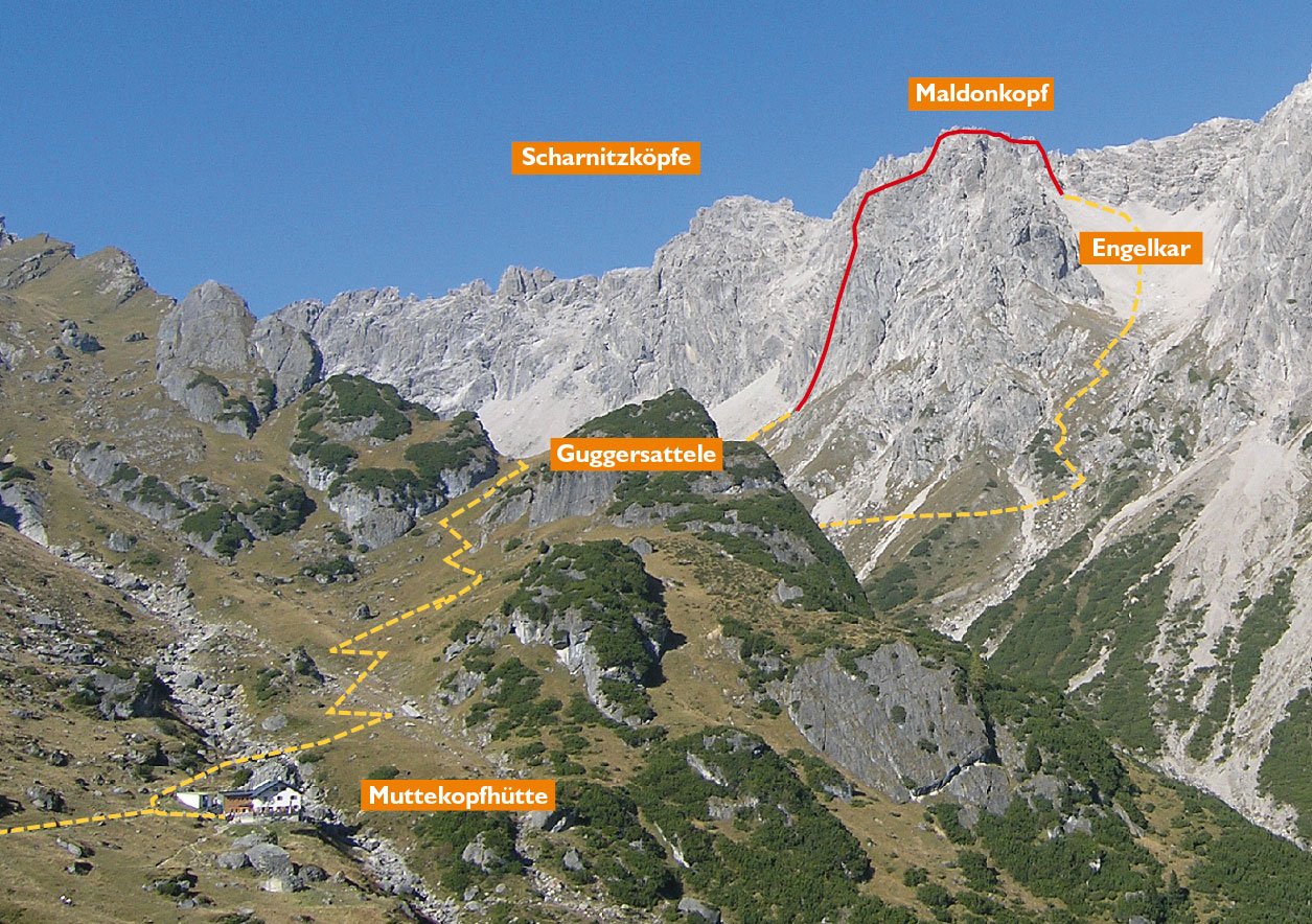 Von Hochimst auf Weg 621 (Forststraße) zur Untermarkter Alm. Über die Schipiste rechtshaltend zur Latschenhütte. Weiter auf Weg 621 zur Muttekopfhütte aufsteigen. Von hier über Weg 622 auf das Guggersattele und ins Scharnitzkar. Dem Wegweiser folgend rechts abzweigen und über Geröll zum Einstieg.
